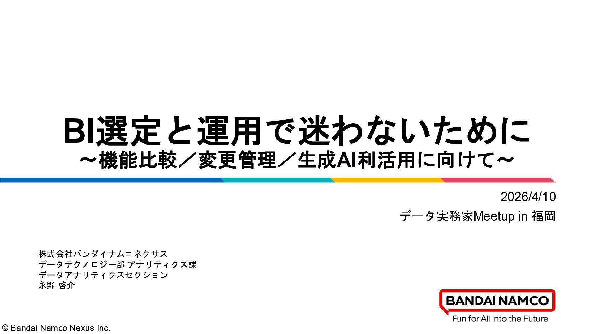 © Bandai Namco Nexus Inc. BI選定と運用で迷わないために 〜機能比較/変更管理/生成AI利活用に向けて〜 2026/4/10 データ実務家Meetup in
