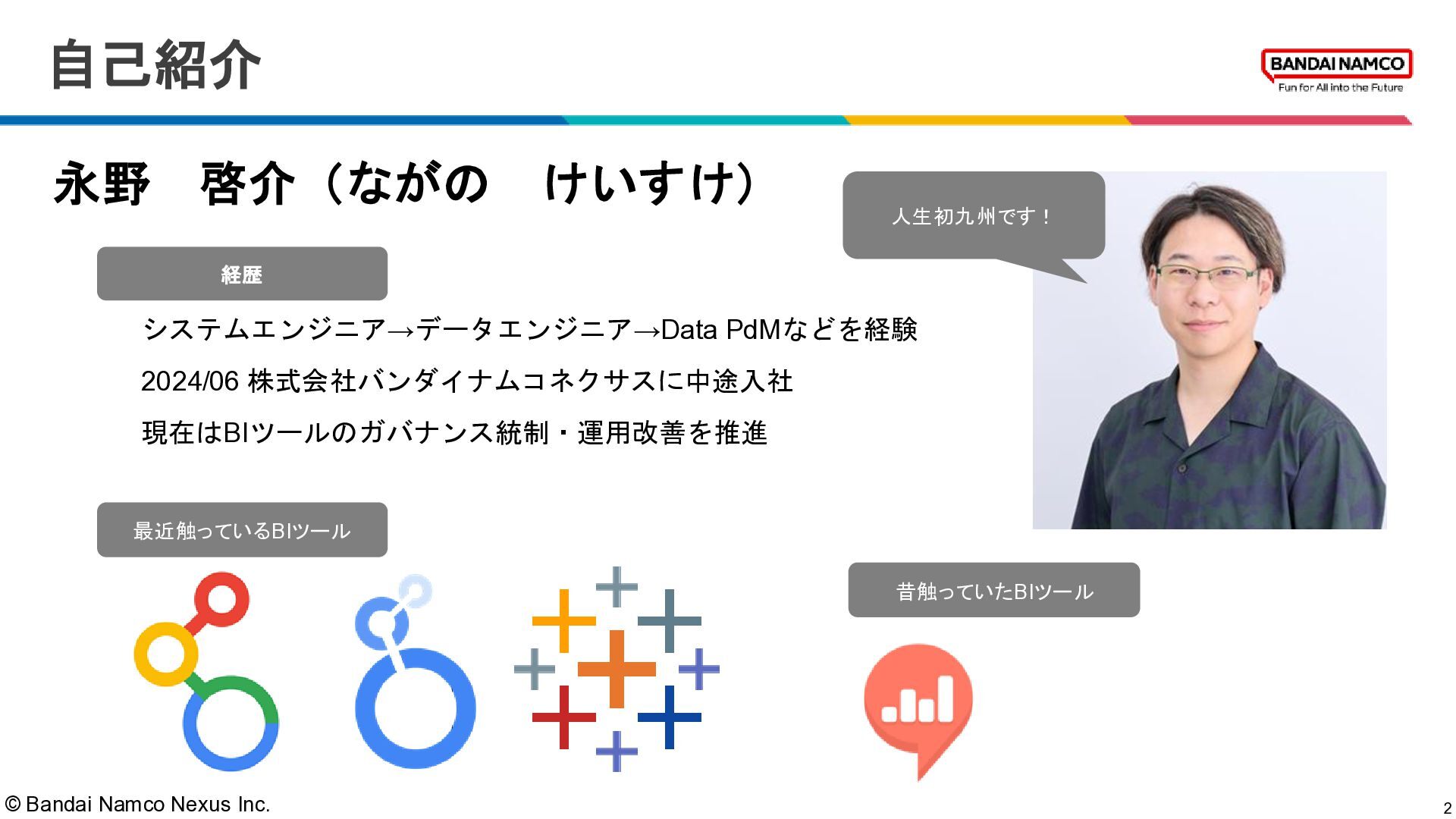PdMなどを経験 2024/06 株式会社バンダイナムコネクサスに中途入社 現在はBIツールのガバナンス統制・運用改善を推進 自己紹介 経歴 最近触っているBIツール 昔触っていたBIツール 人生初九州です!