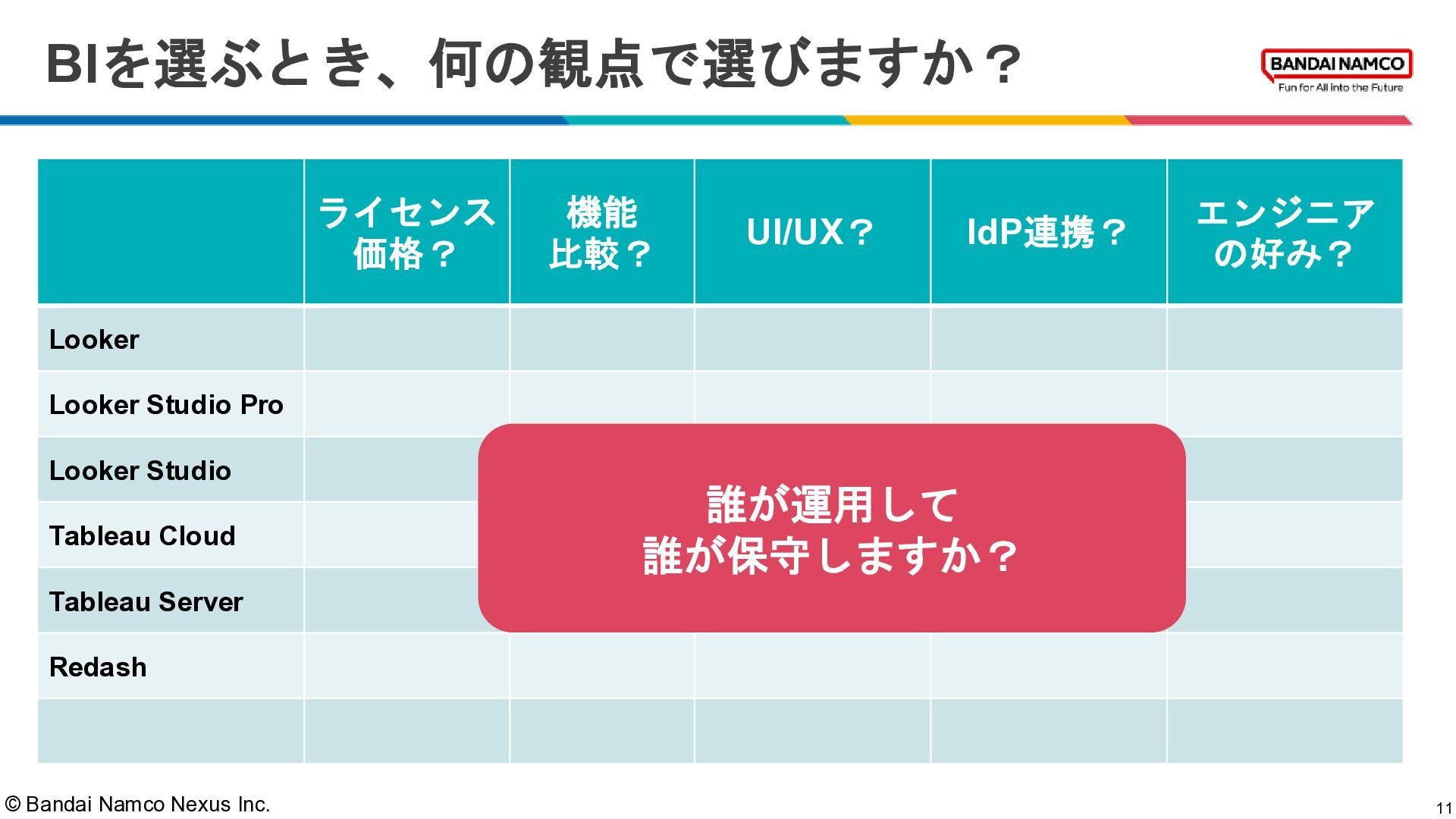 © Bandai Namco Nexus Inc. BIを選ぶとき、何の観点で選びますか? 11 ライセンス 価格? 機能