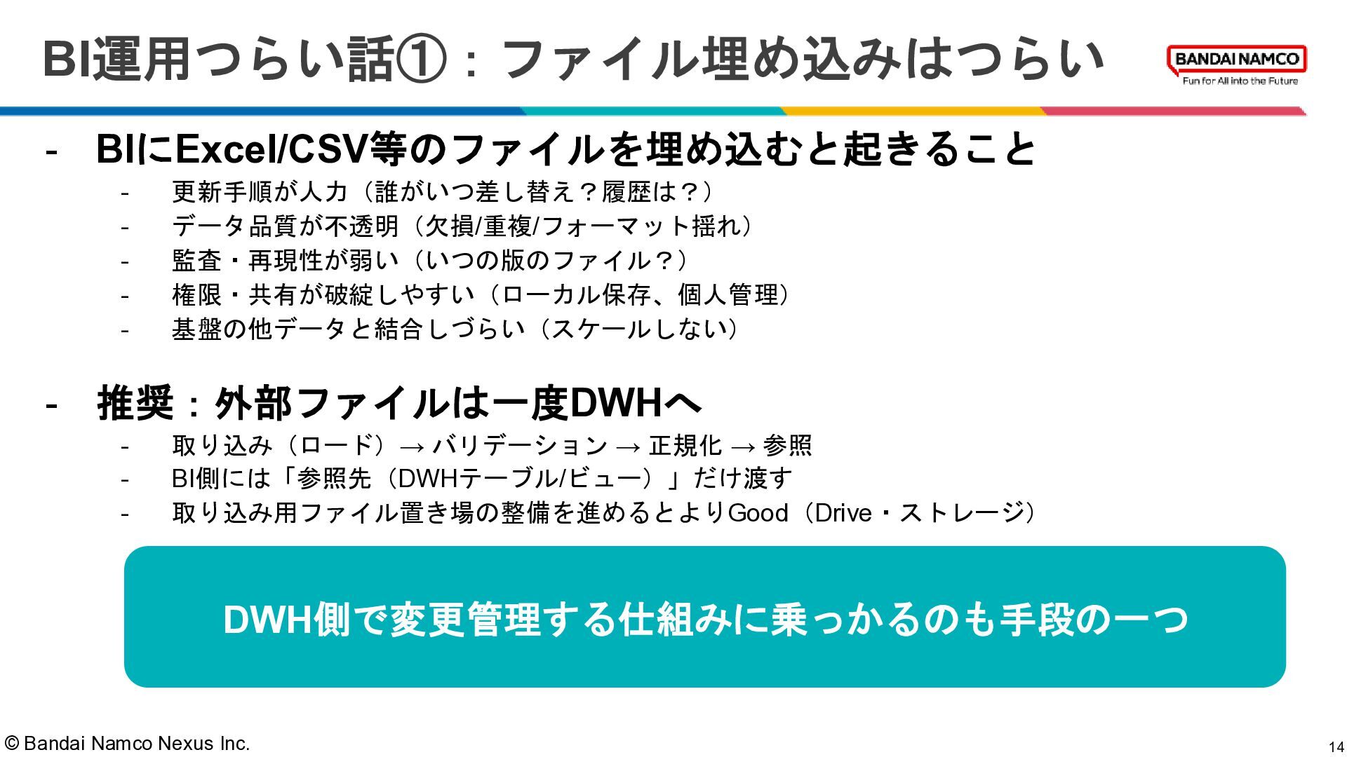 © Bandai Namco Nexus Inc. BI運用つらい話①:ファイル埋め込みはつらい 14 - BIにExcel/CSV等のファイルを埋め込むと起きること -
