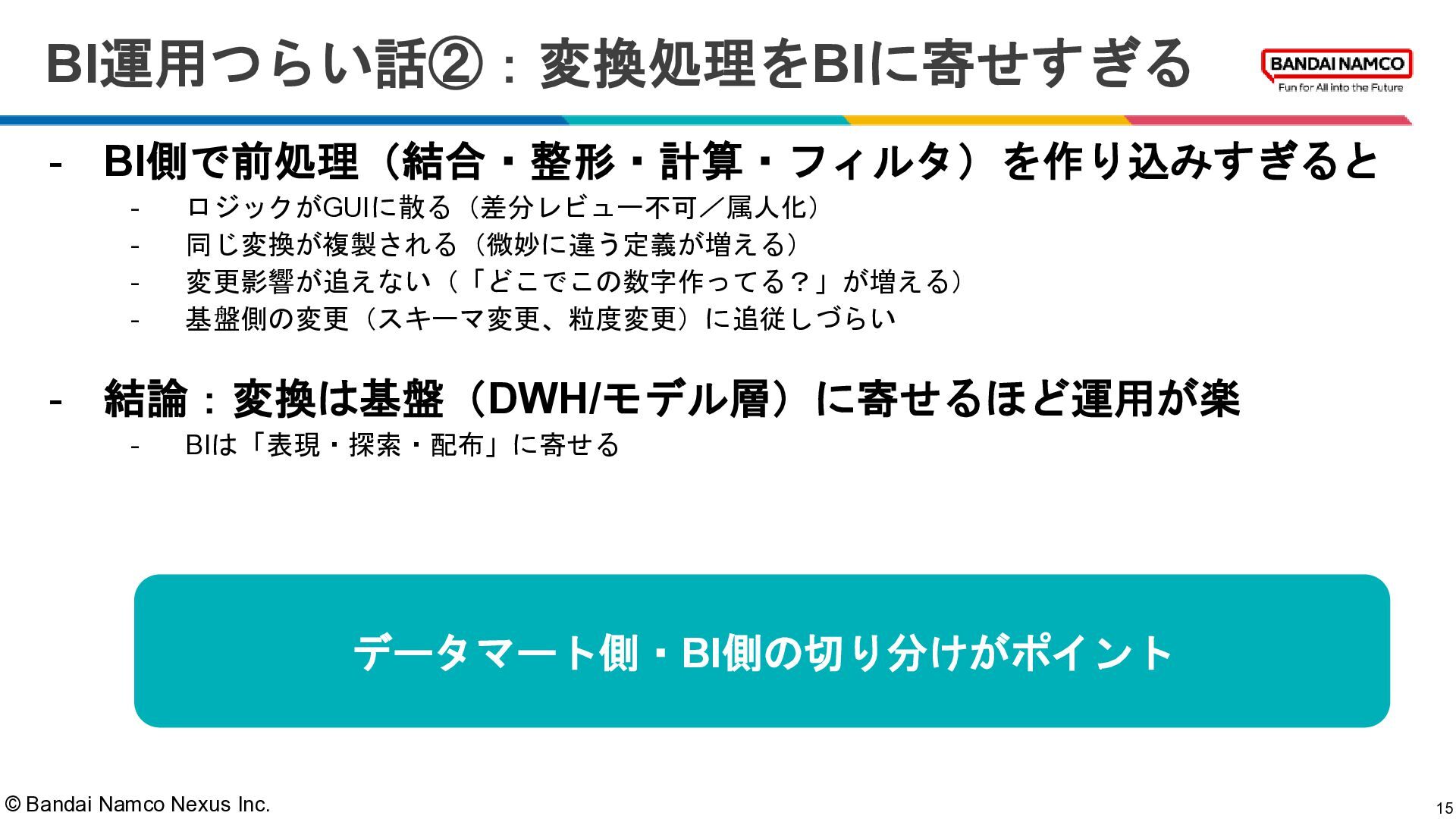 © Bandai Namco Nexus Inc. BI運用つらい話②:変換処理をBIに寄せすぎる 15 - BI側で前処理(結合・整形・計算・フィルタ)を作り込みすぎると -