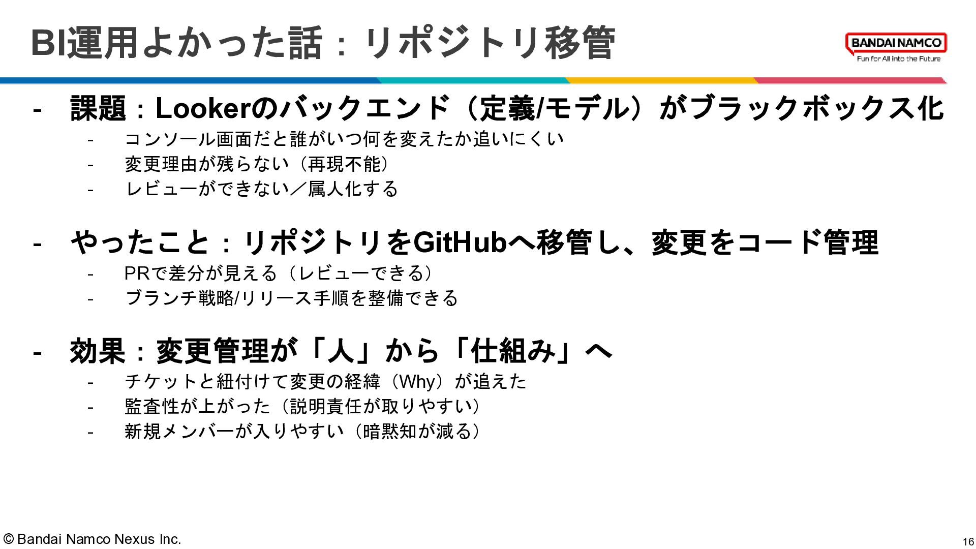 © Bandai Namco Nexus Inc. BI運用よかった話:リポジトリ移管 16 - 課題:Lookerのバックエンド(定義/モデル)がブラックボックス化 -