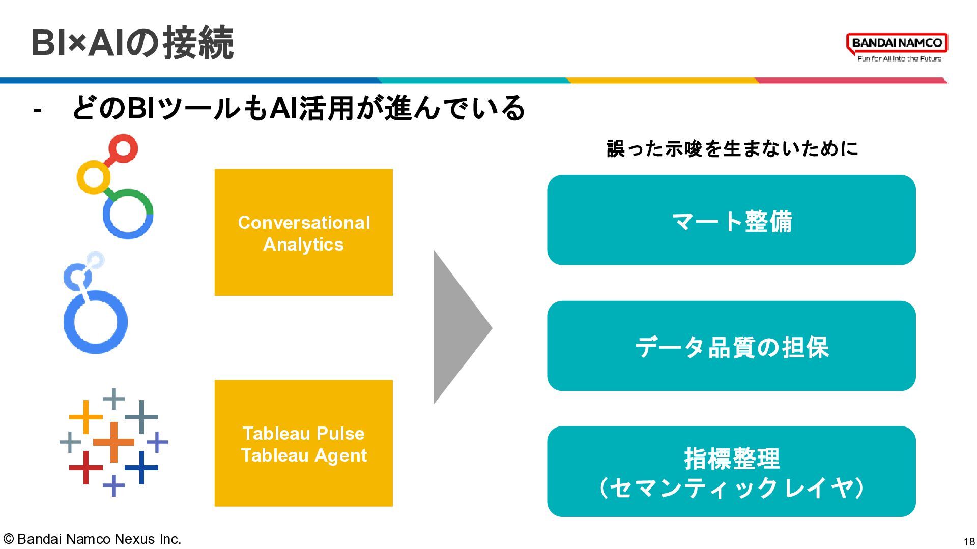 © Bandai Namco Nexus Inc. BI×AIの接続 18 - どのBIツールもAI活用が進んでいる マート整備
