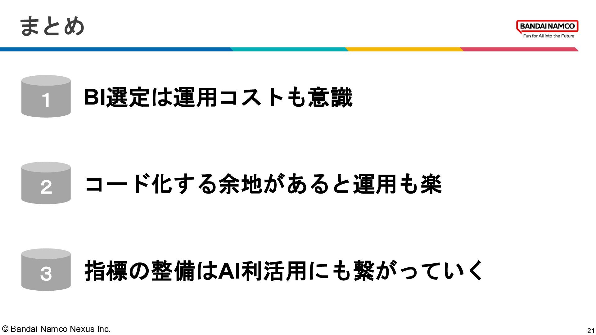 © Bandai Namco Nexus Inc. まとめ 21 BI選定は運用コストも意識 1 2