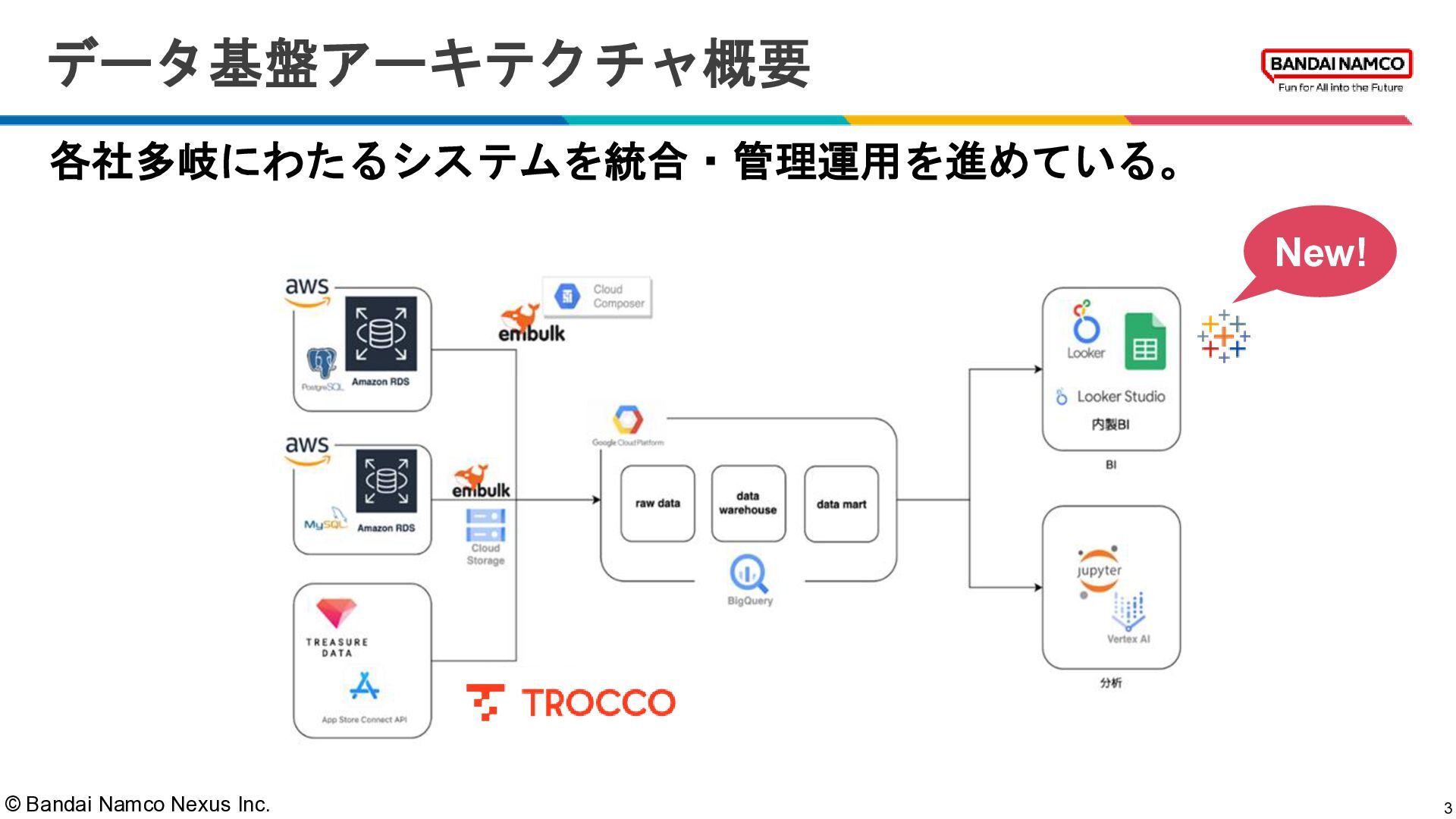 © Bandai Namco Nexus Inc. 各社多岐にわたるシステムを統合・管理運用を進めている。 3 データ基盤アーキテクチャ概要 New!