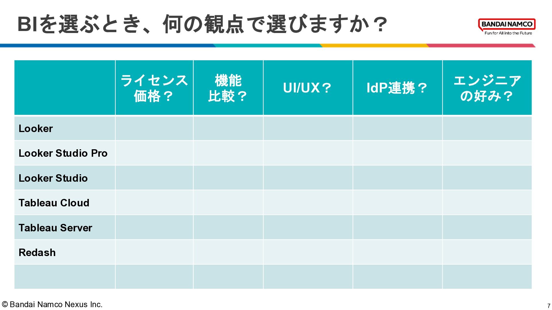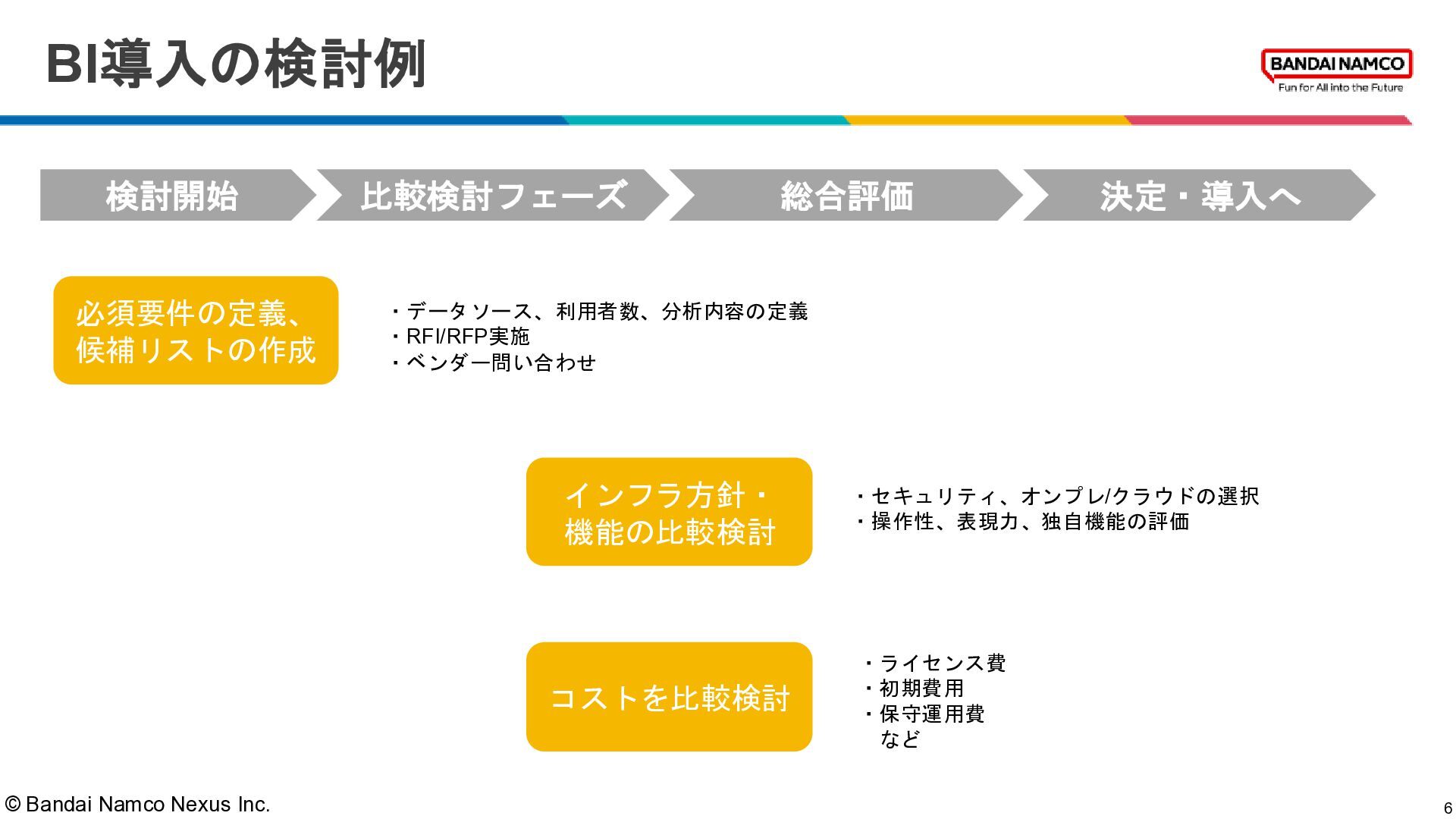© Bandai Namco Nexus Inc. BI導入の検討例 6 比較検討フェーズ 検討開始 総合評価