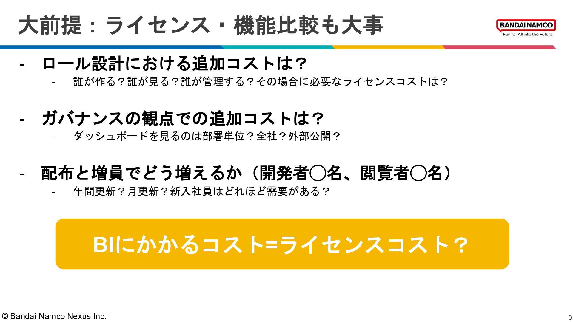 © Bandai Namco Nexus Inc. BIを選ぶとき、何の観点で選びますか? 7 ライセンス 価格? 機能