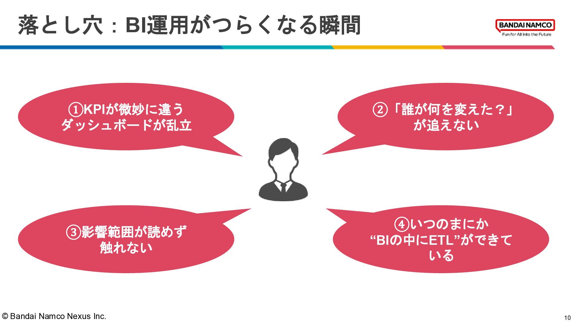 © Bandai Namco Nexus Inc. 落とし穴:BI運用がつらくなる瞬間 10 ①KPIが微妙に違う ダッシュボードが乱立 ③影響範囲が読めず