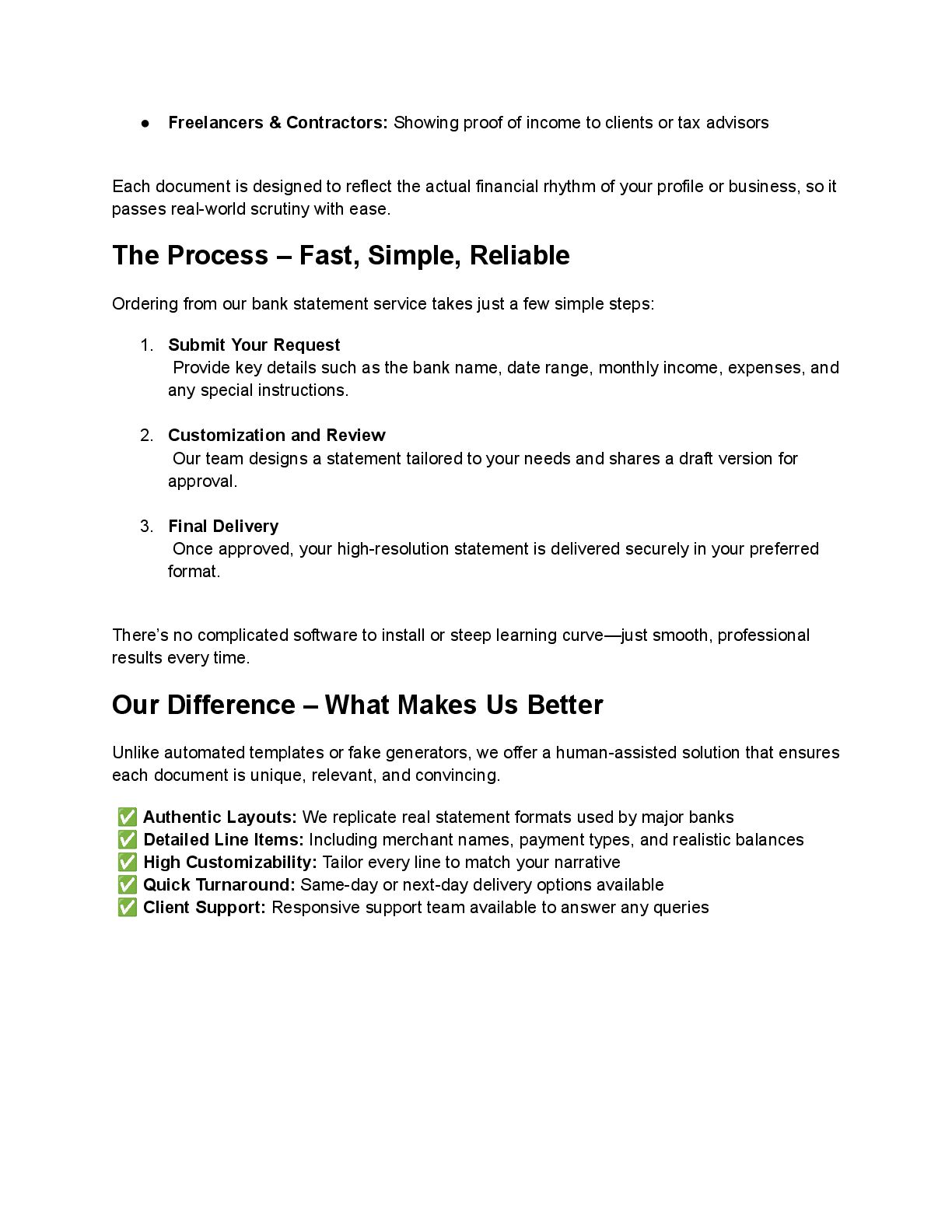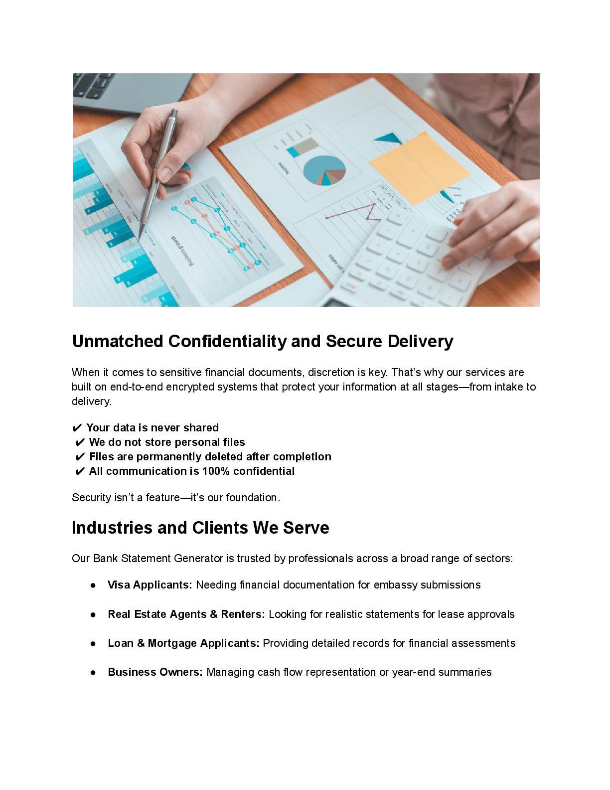 Bank Statement Generator is a trusted, comprehensive solution for managing essential financial documents with accuracy and ease. Our service specializes in creating authentic bank statements, detailed pay stubs, precise 1099 tax return forms and W2 tax return forms, and accurate credit card reports.