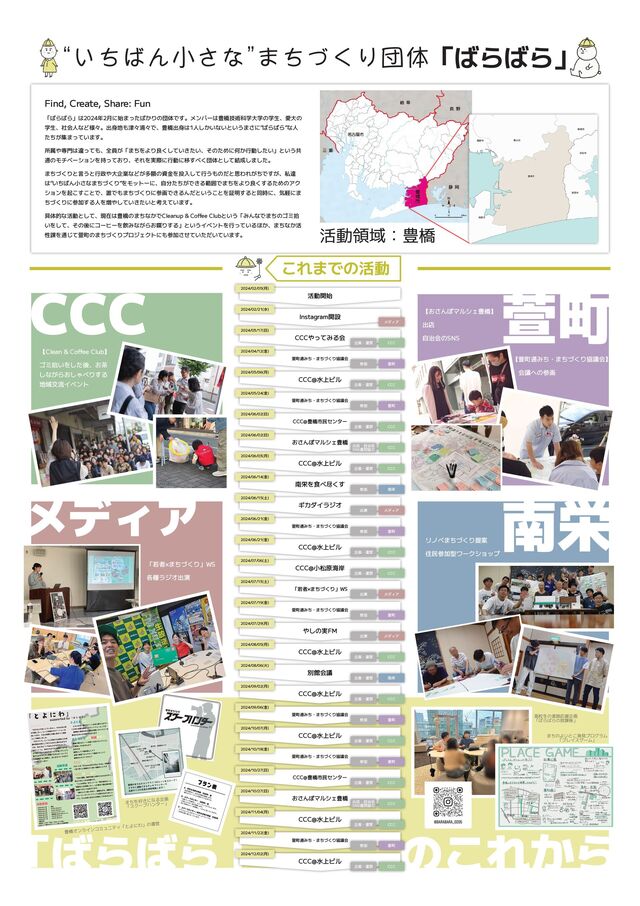 まちづくりと言うと行政や大企業などが多額の資金を投入して行うものだと思われがちですが、私達 は”いちばん小さなまちづくり”をモットーに、自分たちができる範囲でまちをより良くするためのアク ションを起こすことで、誰でもまちづくりに参画できるんだということを証明すると同時に、気軽にま ちづくりに参加する人を増やしていきたいと考えています。 具体的な活動として、現在は豊橋のまちなかでCleanup & Coffee Clubという「みんなでまちのゴミ拾 いをして、その後にコーヒーを飲みながらお喋りする」というイベントを行っているほか、まちなか活 性課を通じて萱町のまちづくりプロジェクトにも参加させていただいています。 活動領域:豊橋 メディア 萱町 CCC 「ばらばら」 のこれから 南栄 Instagram開設 メディア 2024/02/21(水) 活動開始 2024/02/05(月) CCCやってみる会 CCC 企画・運営 2024/03/17(日) 萱町通みち・まちづくり協議会 萱町 参加 2024/04/12(金) 萱町通みち・まちづくり協議会 萱町 参加 2024/05/24(金) 萱町通みち・まちづくり協議会 萱町 参加 2024/06/21(金) 萱町通みち・まちづくり協議会 萱町 参加 2024/07/19(金) 萱町通みち・まちづくり協議会 萱町 参加 2024/09/06(金) 萱町通みち・まちづくり協議会 萱町 参加 2024/10/18(金) 萱町通みち・まちづくり協議会 萱町 参加 2024/11/22(金) CCC@水上ビル CCC 企画・運営 2024/05/06(月) CCC@豊橋市民センター CCC 企画・運営 2024/06/02(日) CCC@豊橋市民センター CCC 企画・運営 2024/10/27(日) CCC@水上ビル CCC 企画・運営 2024/06/03(月) 別館会議 南栄 企画・運営 2024/08/06(火) CCC@水上ビル CCC 企画・運営 2024/06/21(金) CCC@水上ビル CCC 企画・運営 2024/08/05(月) CCC@水上ビル CCC 企画・運営 2024/09/02(月) CCC@水上ビル CCC 企画・運営 2024/10/07(月) CCC@水上ビル CCC 企画・運営 2024/11/04(月) CCC@水上ビル CCC 企画・運営 2024/12/02(月) CCC@小松原海岸 CCC 企画・運営 2024/07/06(土) 南栄を食べ尽くす 南栄 参加 2024/06/14(金) ギカダイラジオ メディア 出演 2024/06/15(土) やしの実FM メディア 出演 2024/07/29(月) 「若者×まちづくり」WS メディア 出演 2024/07/13(土) おさんぽマルシェ豊橋 CCC 出店・自治会 SNS運用協力 2024/06/02(日) おさんぽマルシェ豊橋 CCC 出店・自治会 SNS運用協力 2024/10/27(日) これまでの活動 【Clean & Coffee Club】 ゴミ拾いをした後、お茶 しながらおしゃべりする 地域交流イベント 「若者×まちづくり」WS 各種ラジオ出演 リノベまちづくり提案 住民参加型ワークショップ 【萱町通みち・まちづくり協議会】 会議への参画 【おさんぽマルシェ豊橋】 出店 自治会のSNS 豊橋オンラインコミュニティ「とよにわ」の運営 まちを好きになる企画 「スクープハンター」 高校生の進路応援企画 「ばらばらの放課後」 まちのよいとこ発見プログラム 「プレイスゲーム」
