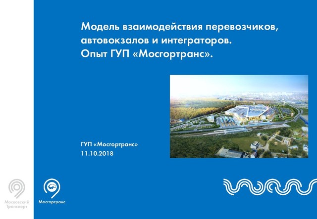 автовокзалов и интеграторов. Опыт ГУП «Мосгортранс». Предпринимаемые ГУП «Мосгортранс» шаги осуществляются в русле государственной политики: поручений по итогам Госсовета, реализации задачи создания экосистемы цифровой экономики. Модель взаимодействия предприятия с перевозчиками и интеграторами направлена на выполнение поручения Президента Российской Федерации В.В. Путина от 01.07.2015 о расширении использования электронных систем дистанционной продажи билетов на междугородные автобусные маршруты.