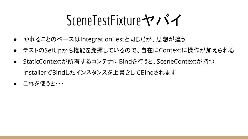 SceneTestFixtureヤバイ • やれることのベースはIntegrationTestと同じだが、思想が違う • テストのSetUpから権能を発揮しているので、自在にContextに操作が加えられる • StaticContextが所有するコンテナにBindを行うと、SceneContextが持つ InstallerでBindしたインスタンスを上書きしてBindされます • これを使うと・・・