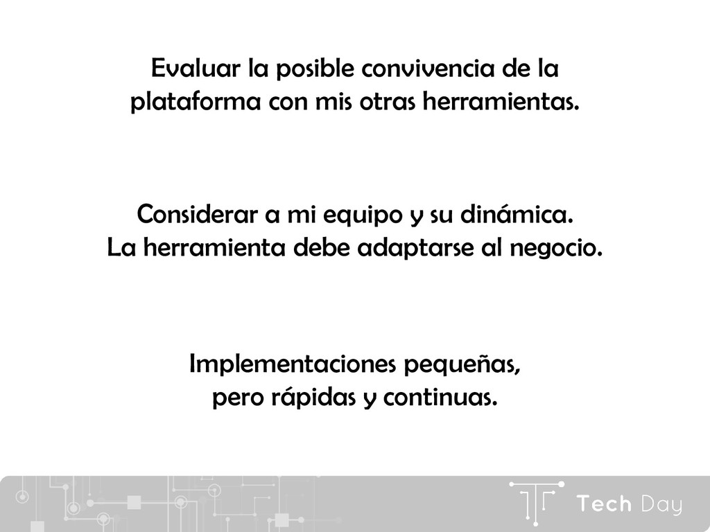 herramientas. Considerar a mi equipo y su dinámica. La herramienta debe adaptarse al negocio. Implementaciones pequeñas, pero rápidas y continuas.