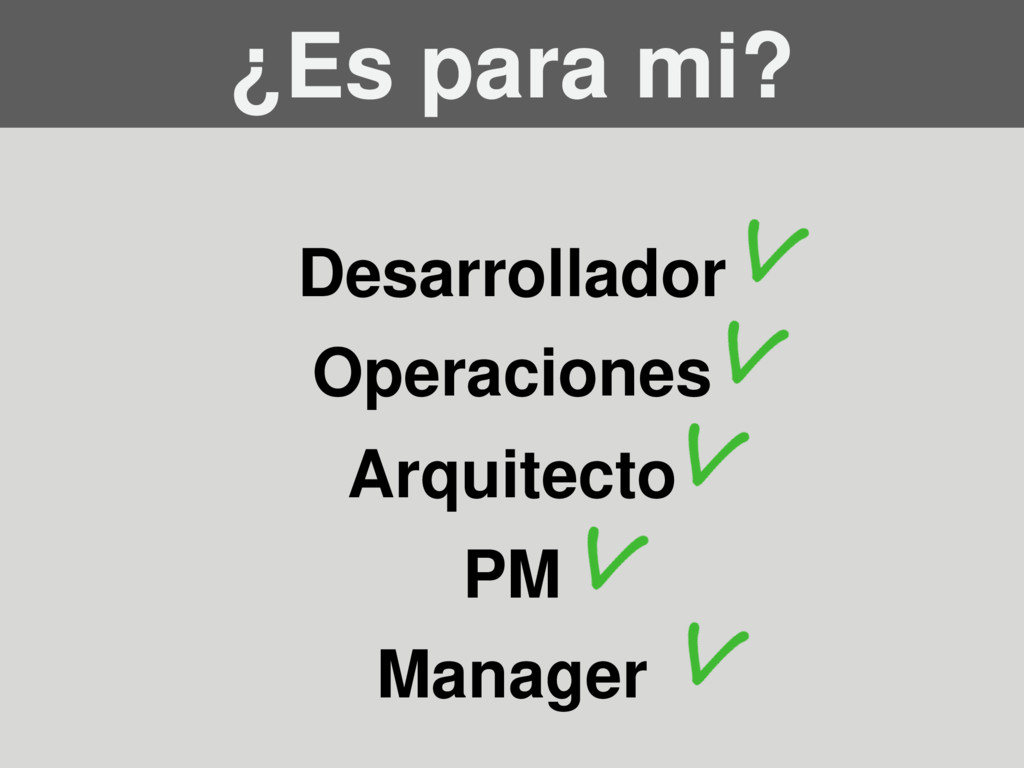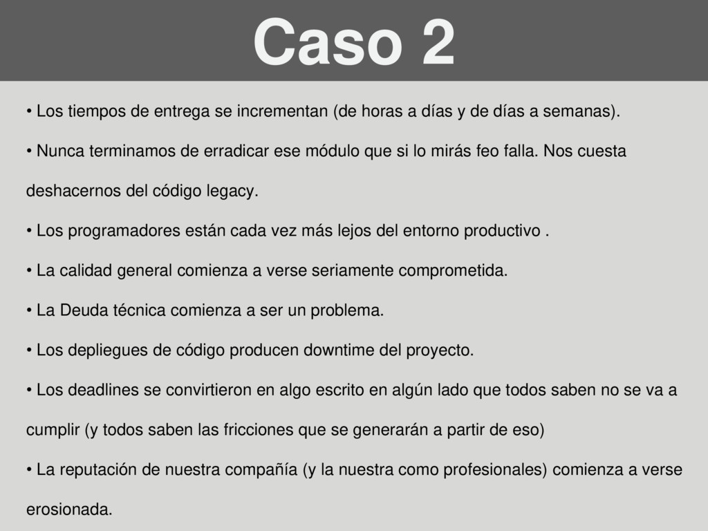 horas a días y de días a semanas). • Nunca terminamos de erradicar ese módulo que si lo mirás feo falla. Nos cuesta deshacernos del código legacy. • Los programadores están cada vez más lejos del entorno productivo . • La calidad general comienza a verse seriamente comprometida. • La Deuda técnica comienza a ser un problema. • Los depliegues de código producen downtime del proyecto. • Los deadlines se convirtieron en algo escrito en algún lado que todos saben no se va a cumplir (y todos saben las fricciones que se generarán a partir de eso) • La reputación de nuestra compañía (y la nuestra como profesionales) comienza a verse erosionada.