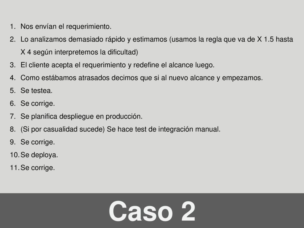 demasiado rápido y estimamos (usamos la regla que va de X 1.5 hasta X 4 según interpretemos la dificultad) 3. El cliente acepta el requerimiento y redefine el alcance luego. 4. Como estábamos atrasados decimos que si al nuevo alcance y empezamos. 5. Se testea. 6. Se corrige. 7. Se planifica despliegue en producción. 8. (Si por casualidad sucede) Se hace test de integración manual. 9. Se corrige. 10.Se deploya. 11.Se corrige.