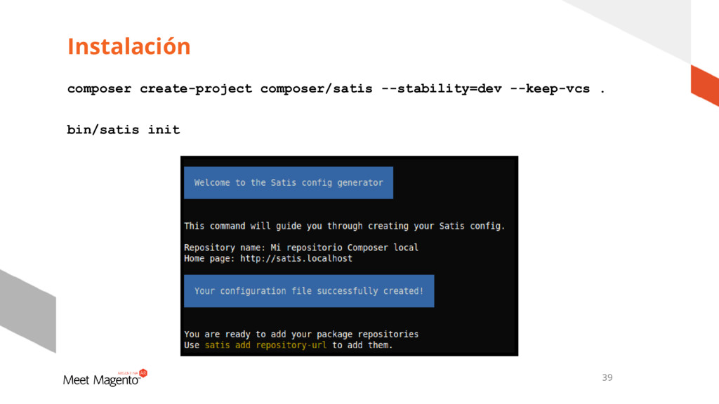 composer create-project composer/satis --stability=dev --keep-vcs . bin/satis init Instalación 39