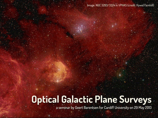 Surveys”; key members are from institutes in UK/NL/Spain. • Composed of two surveys in the North (IPHAS/UVEX) and one survey in the South (VPHAS+). • Covers the entire Galactic Plane at |b| < 5° in u’, g’, r’, i’, Hα (near-simultaneous). • 5σ-depth typically at g’ > 22 / r’ > 21. (complete to r’ ~ 19; saturated at r’ ~ 13.)