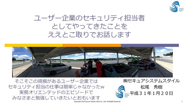 代表取締役 松尾 秀樹 取締役 乗口 雅充 従業員数 5名(エンジニアおよびアナリスト) (東京都千代田区神田小川町3-8) (03-5577-6934) 事業内容 情報セキュリティに関する コンサルティング サービス、セキュリティ・アウトソーシング サービス 企業のセキュリティ担当者が実施する施策や規 定の制定、具体的ソリューションの提示、運用 法などをご提案いたします。 代表取締役 松尾秀樹 株式会社セキュアシステムスタイル ◼ 2014年11月に設立 ◼ 企業のセキュリティ担当者が実施す るセキュリティ施策について、 規程の制定、具体的ソリューション の提示・運用などを提案させて いただいています。 『セキュリティダイレクタを育てる』 Copyright 2019 Secure System Style Co., Ltd. All Rights Reserved