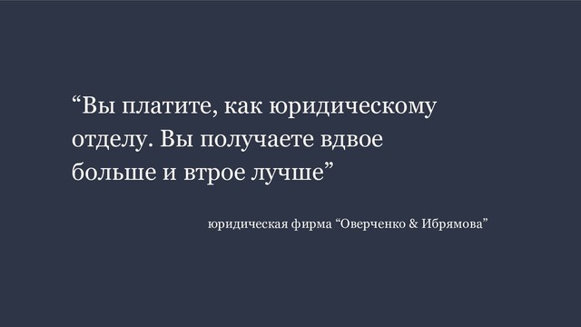 зависимости от объема работ. Рассчитываем индивидуально, в зависимости от сложности дела. Юридическое сопровождение Судебное представительство Мы стоим, как ваш юридический отдел. Но мы работаем быстрее, слаженнее и эффективнее.