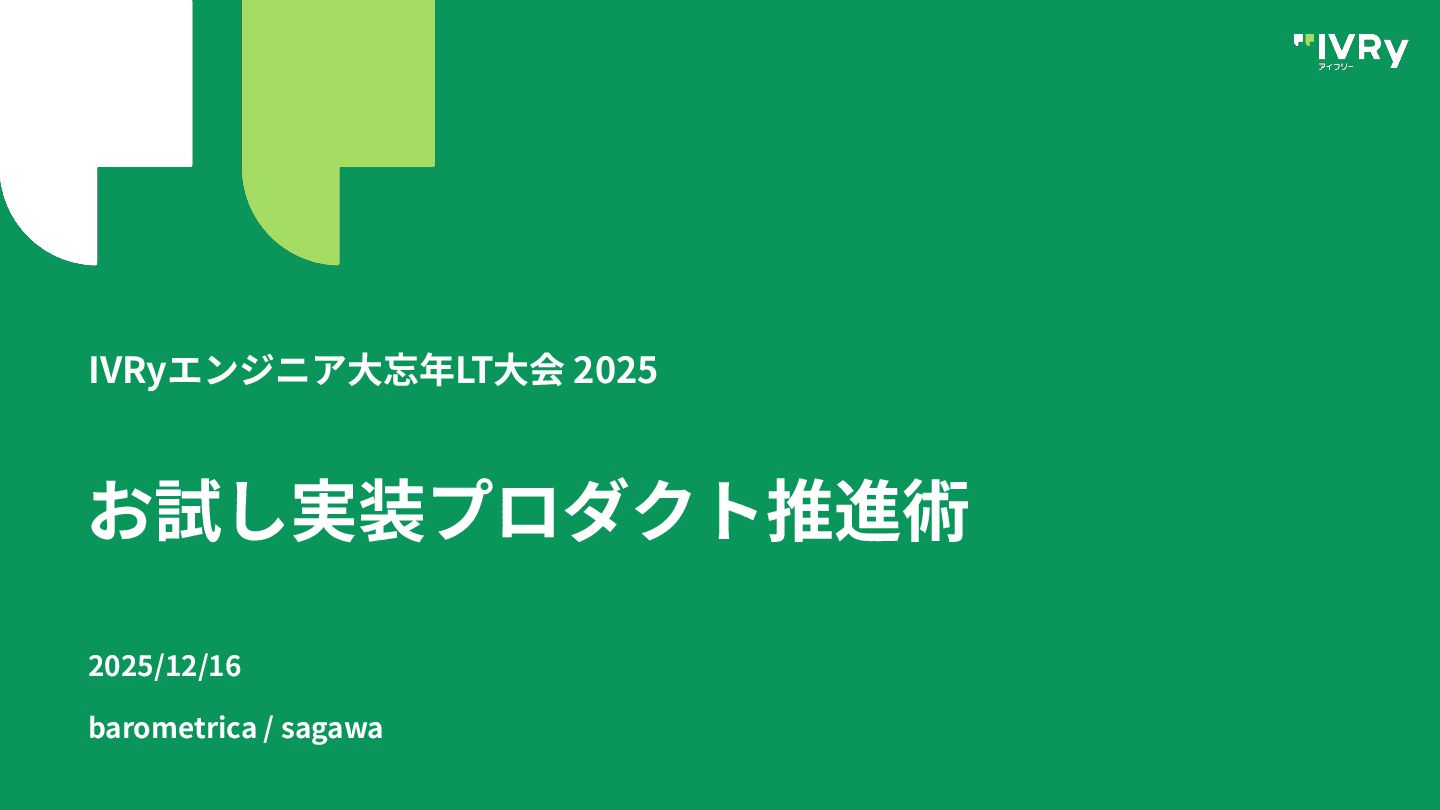 お試し実装プロダクト推進術 IVRyエンジニア⼤忘年LT⼤会 2025 2025/12/16 barometrica / sagawa