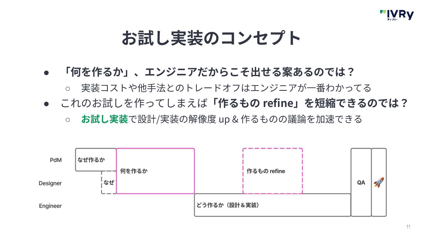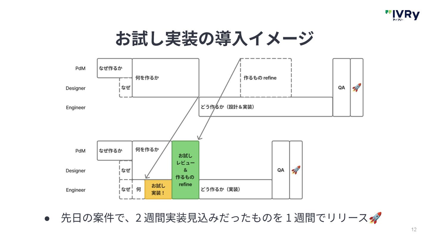 お試し実装のコンセプト 11 • 「何を作るか」、エンジニアだからこそ出せる案あるのでは? ◦ 実装コストや他⼿法とのトレードオフはエンジニアが⼀番わかってる • これのお試しを作ってしまえば「作るもの refine」を短縮できるのでは? ◦
