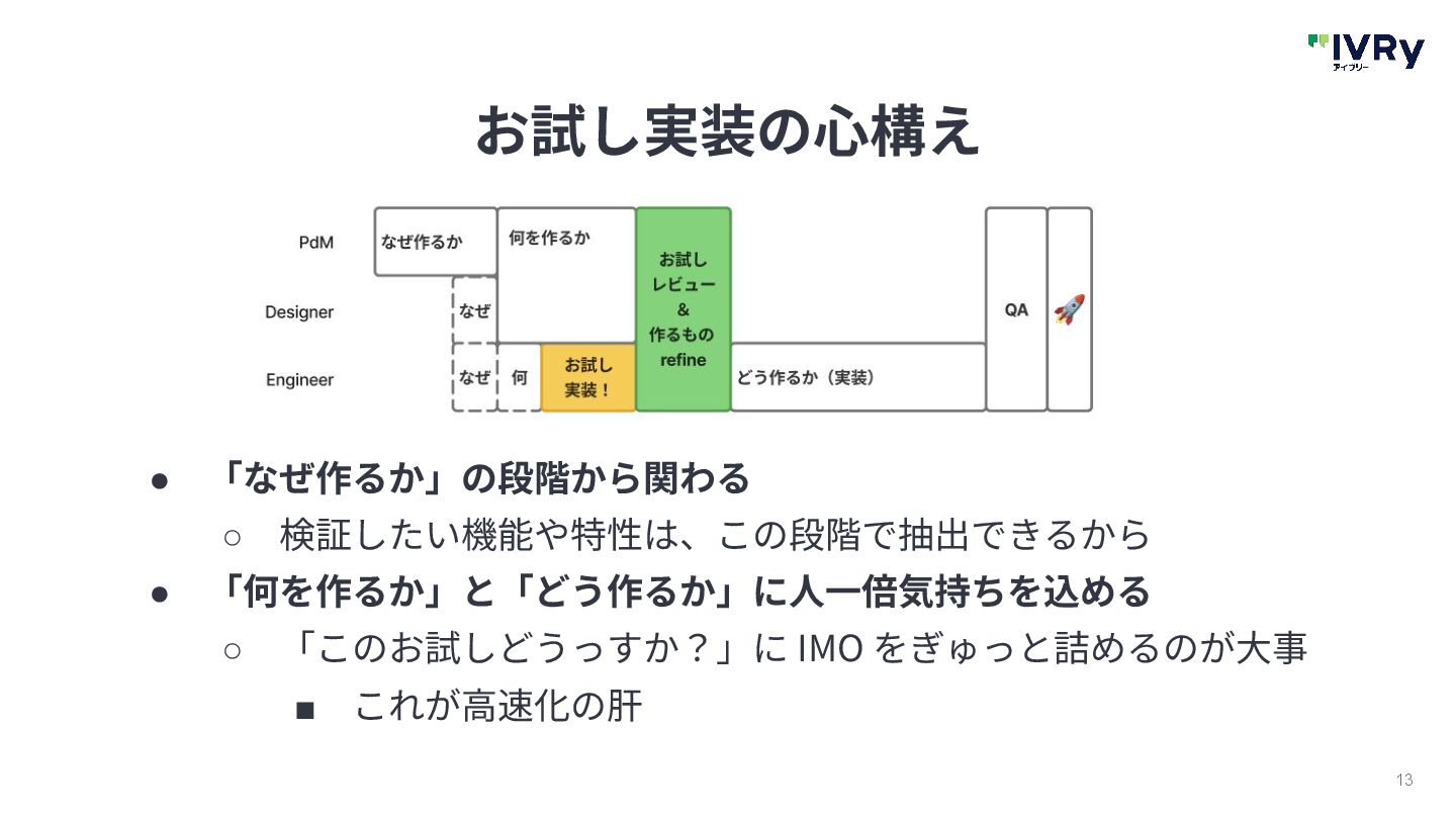 お試し実装の導⼊イメージ 12 • 先⽇の案件で、2 週間実装⾒込みだったものを 1 週間でリリース🚀