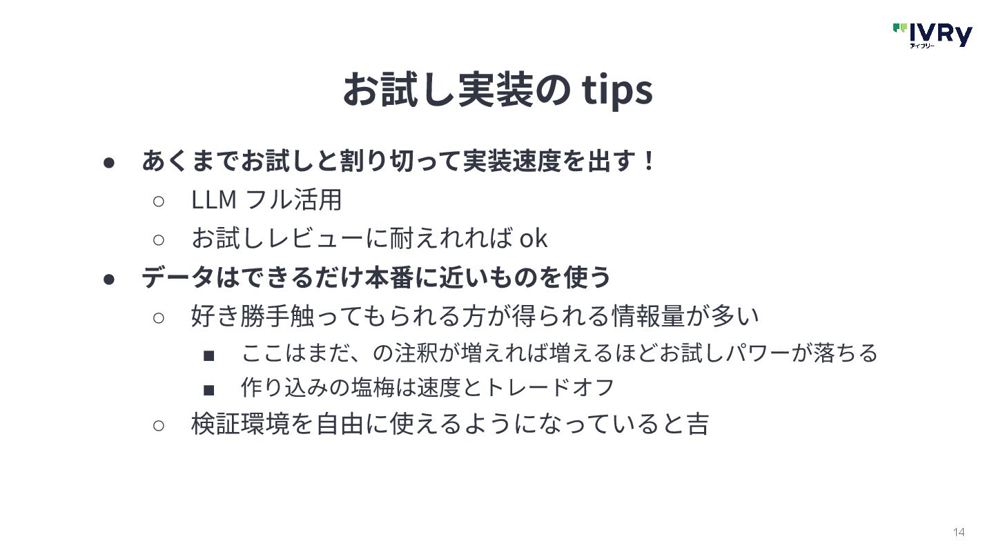 お試し実装の tips 14 • あくまでお試しと割り切って実装速度を出す! ◦ LLM フル活⽤ ◦ お試しレビューに耐えれれば