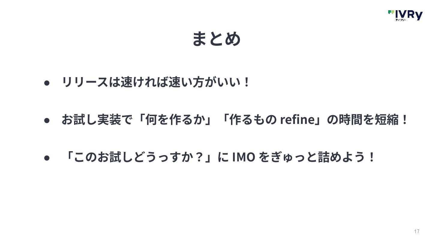 まとめ 17 • リリースは速ければ速い⽅がいい! • お試し実装で「何を作るか」「作るもの refine」の時間を短縮! • 「このお試しどうっすか?」に IMO