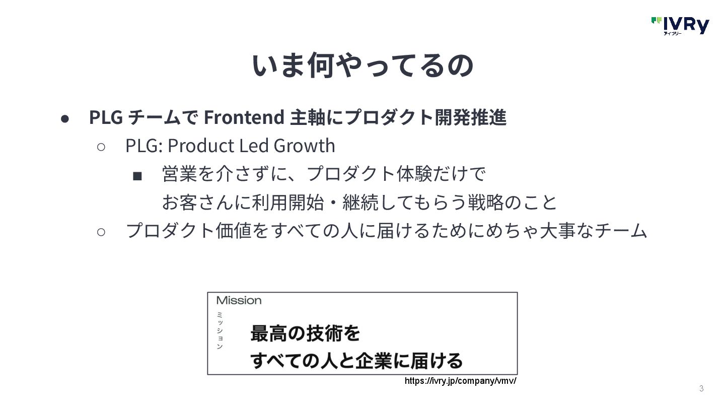 ▪ 営業を介さずに、プロダクト体験だけで お客さんに利⽤開始‧継続してもらう戦略のこと ◦ プロダクト価値をすべての⼈に届けるためにめちゃ⼤事なチーム いま何やってるの 3 https://ivry.jp/company/vmv/
