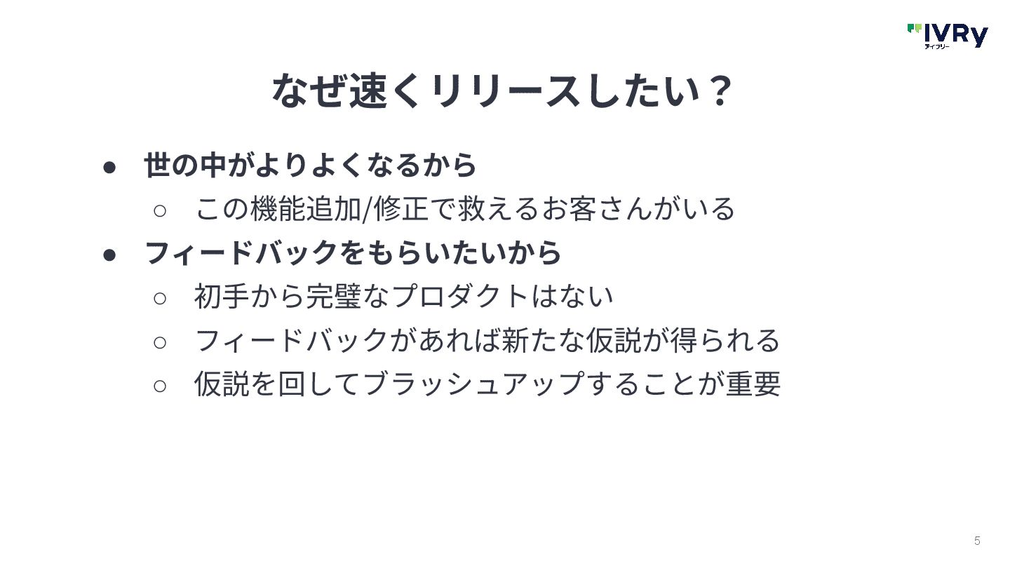 なぜ速くリリースしたい? 5 • 世の中がよりよくなるから ◦ この機能追加/修正で救えるお客さんがいる • フィードバックをもらいたいから ◦ 初⼿から完璧なプロダクトはない