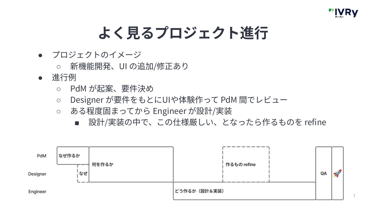 PdM が起案、要件決め ◦ Designer が要件をもとにUIや体験作って PdM 間でレビュー ◦ ある程度固まってから Engineer が設計/実装 ▪ 設計/実装の中で、この仕様厳しい、となったら作るものを refine