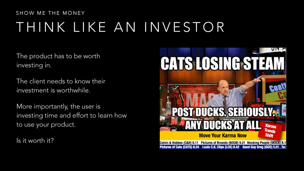 N I N V E S T O R S H O W M E T H E M O N E Y The product has to be worth investing in. The client needs to know their investment is worthwhile. More importantly, the user is investing time and effort to learn how to use your product. Is it worth it?