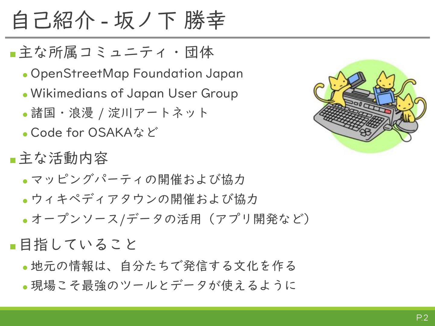 P.2 自己紹介 - 坂ノ下 勝幸 ◼ 主な所属コミュニティ・団体 ⚫ OpenStreetMap Foundation