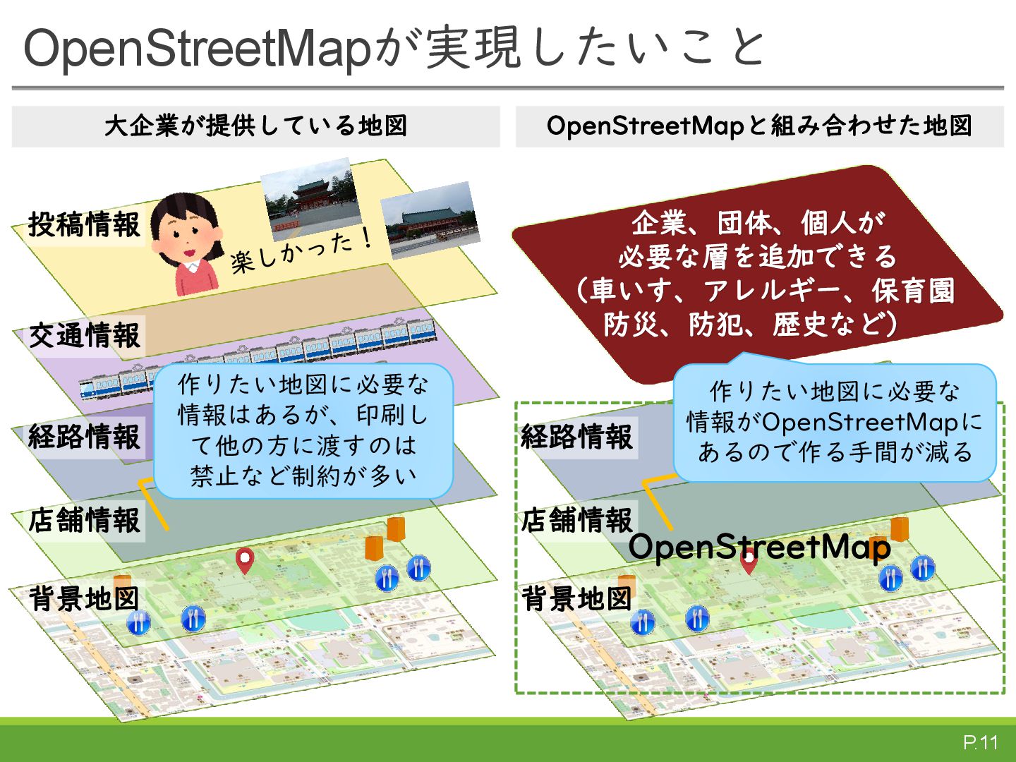 P.11 OpenStreetMapが実現したいこと 店舗情報 背景地図 店舗情報 背景地図 経路情報 投稿情報 経路情報 大企業が提供している地図