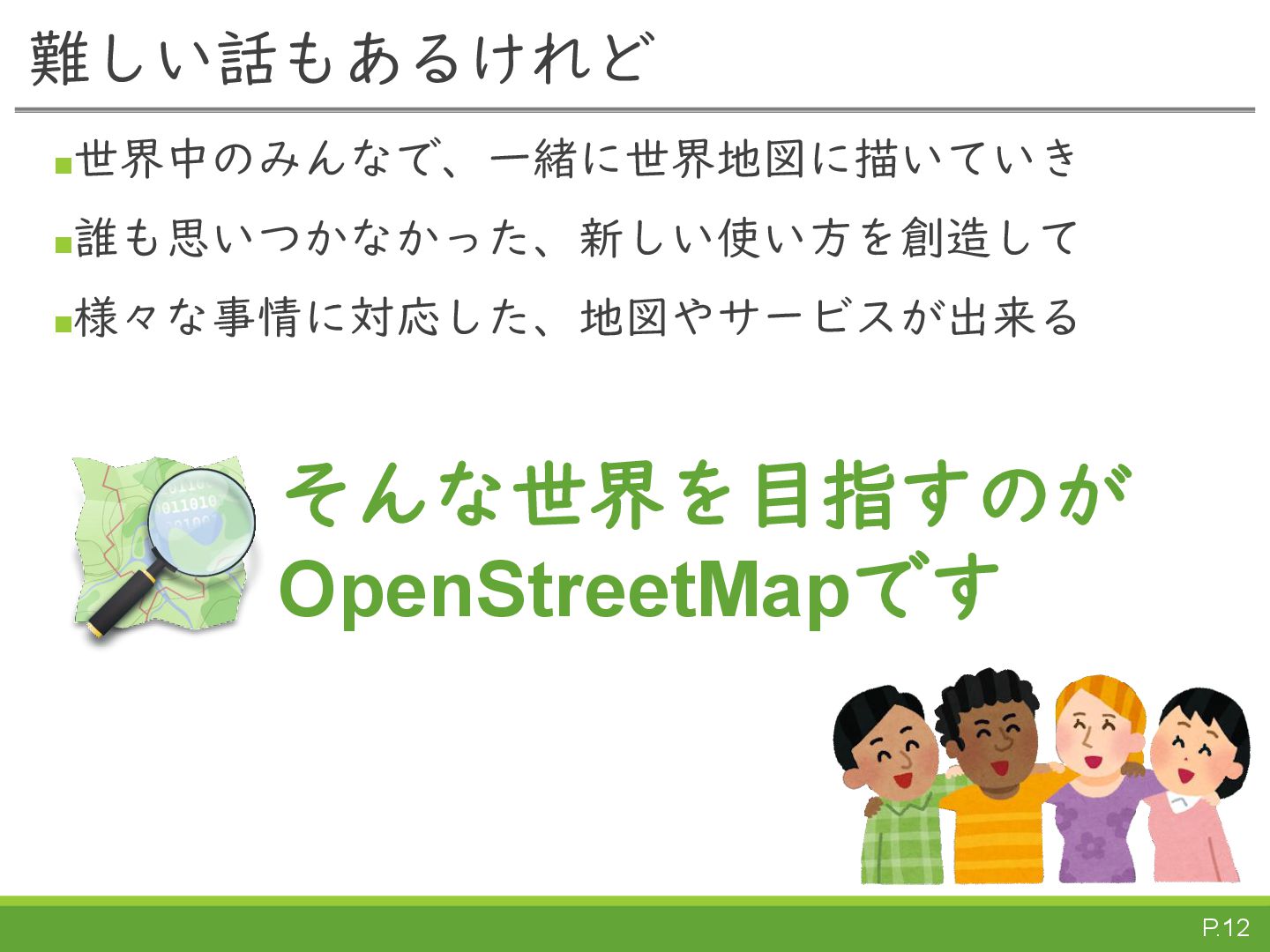 P.12 難しい話もあるけれど ◼ 世界中のみんなで、一緒に世界地図に描いていき ◼ 誰も思いつかなかった、新しい使い方を創造して ◼ 様々な事情に対応した、地図やサービスが出来る そんな世界を目指すのが OpenStreetMapです