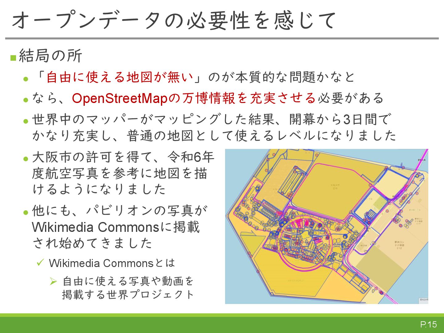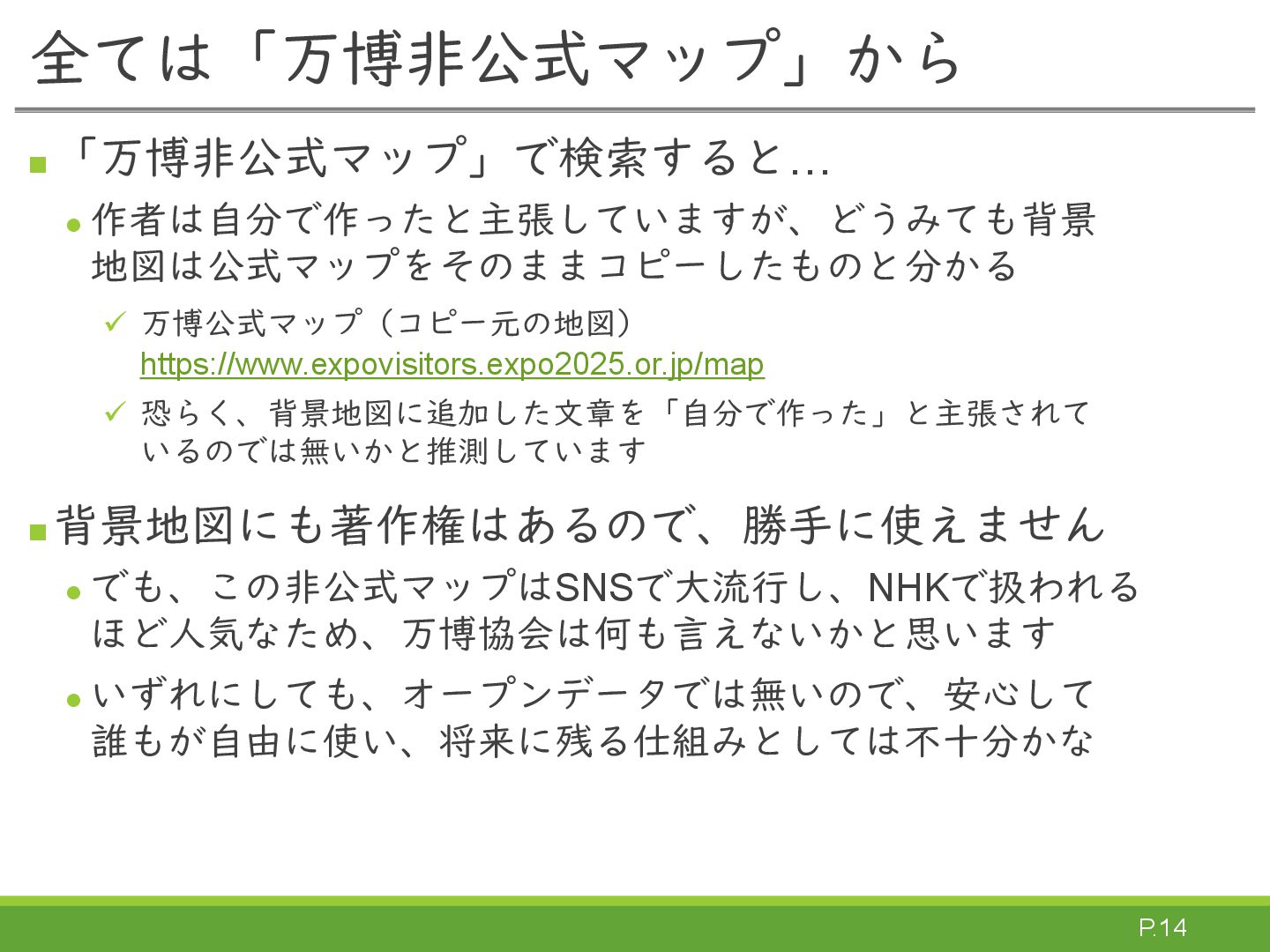 ✓ 恐らく、背景地図に追加した文章を「自分で作った」と主張されて いるのでは無いかと推測しています ◼ 背景地図にも著作権はあるので、勝手に使えません ⚫ でも、この非公式マップはSNSで大流行し、NHKで扱われる ほど人気なため、万博協会は何も言えないかと思います ⚫ いずれにしても、オープンデータでは無いので、安心して 誰もが自由に使い、将来に残る仕組みとしては不十分かな P.14