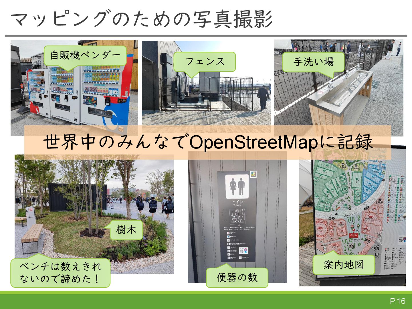 P.16 マッピングのための写真撮影 自販機ベンダー フェンス 手洗い場 案内地図 便器の数 樹木 ベンチは数えきれ ないので諦めた!