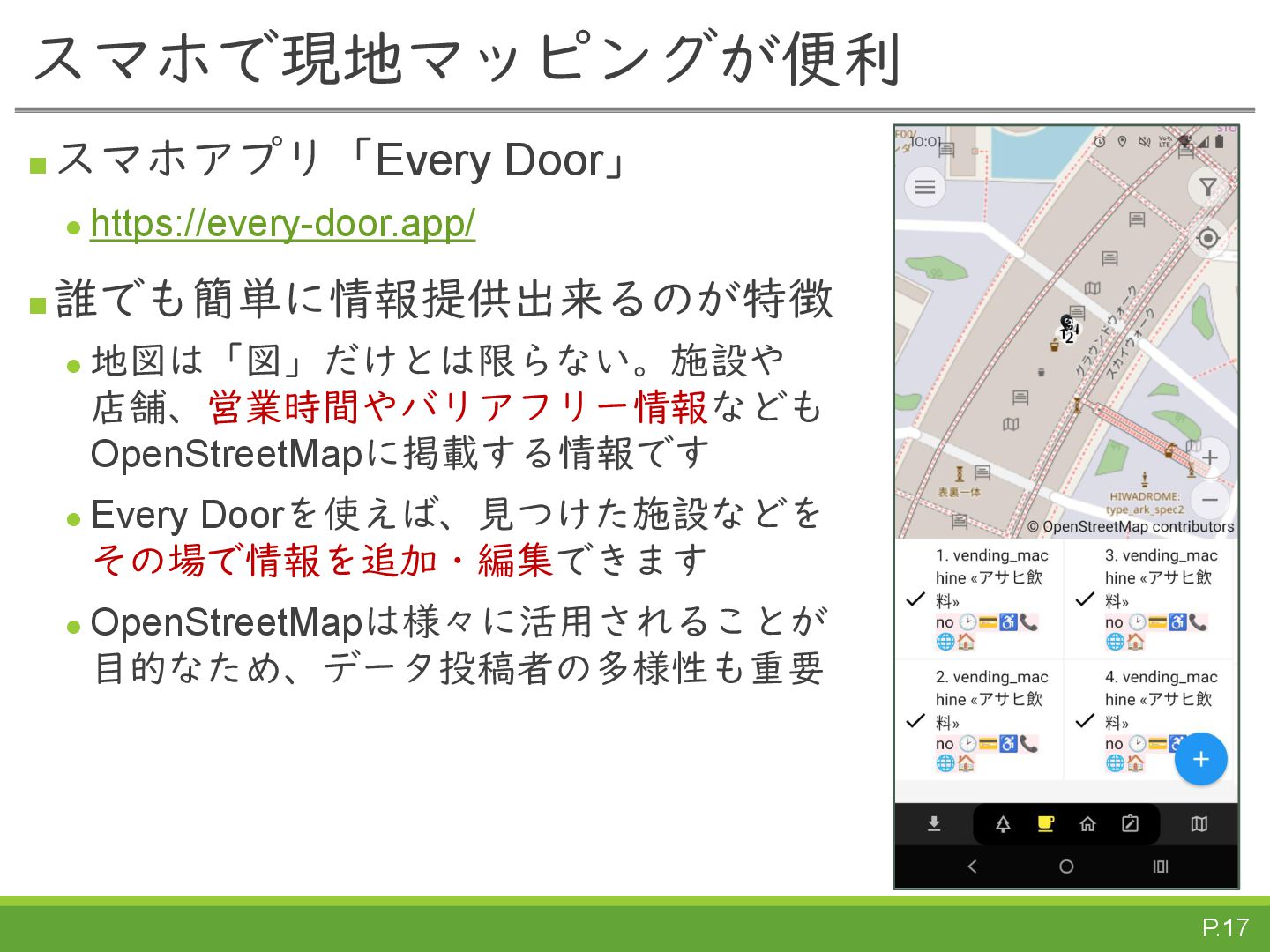 P.17 スマホで現地マッピングが便利 ◼ スマホアプリ「Every Door」 ⚫ https://every-door.app/ ◼ 誰でも簡単に情報提供出来るのが特徴 ⚫
