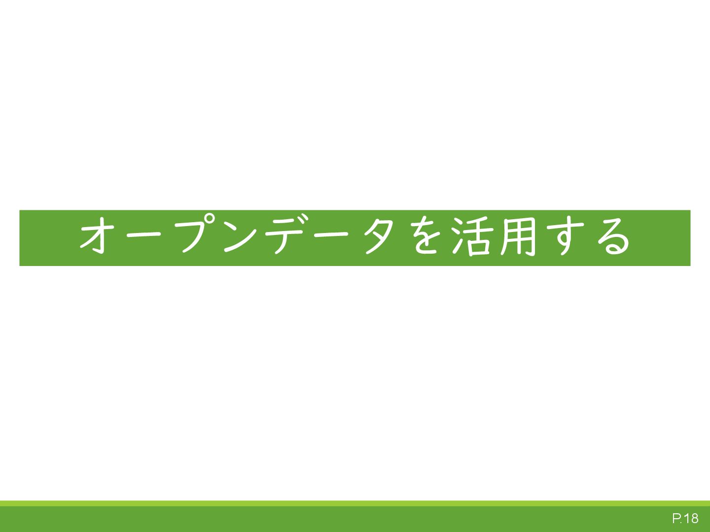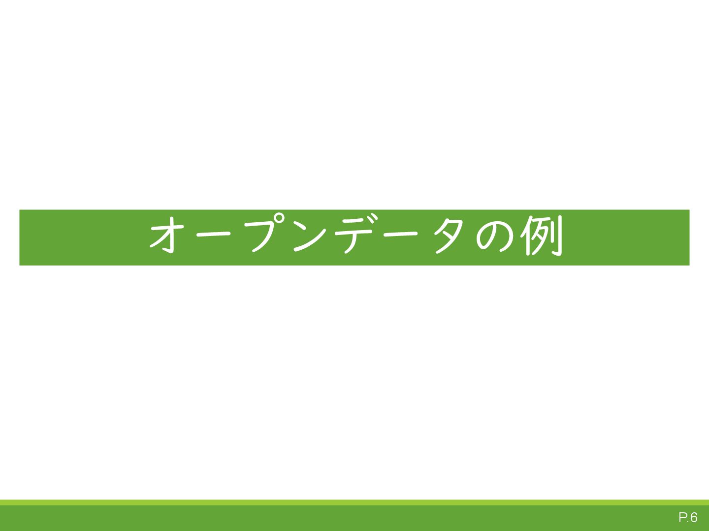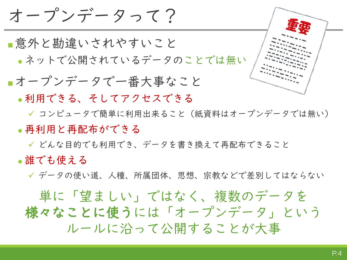 ✓ コンピュータで簡単に利用出来ること(紙資料はオープンデータでは無い) ⚫ 再利用と再配布ができる ✓ どんな目的でも利用でき、データを書き換えて再配布できること ⚫ 誰でも使える ✓ データの使い道、人種、所属団体、思想、宗教などで差別してはならない 単に「望ましい」ではなく、複数のデータを 様々なことに使うには「オープンデータ」という ルールに沿って公開することが大事 P.4