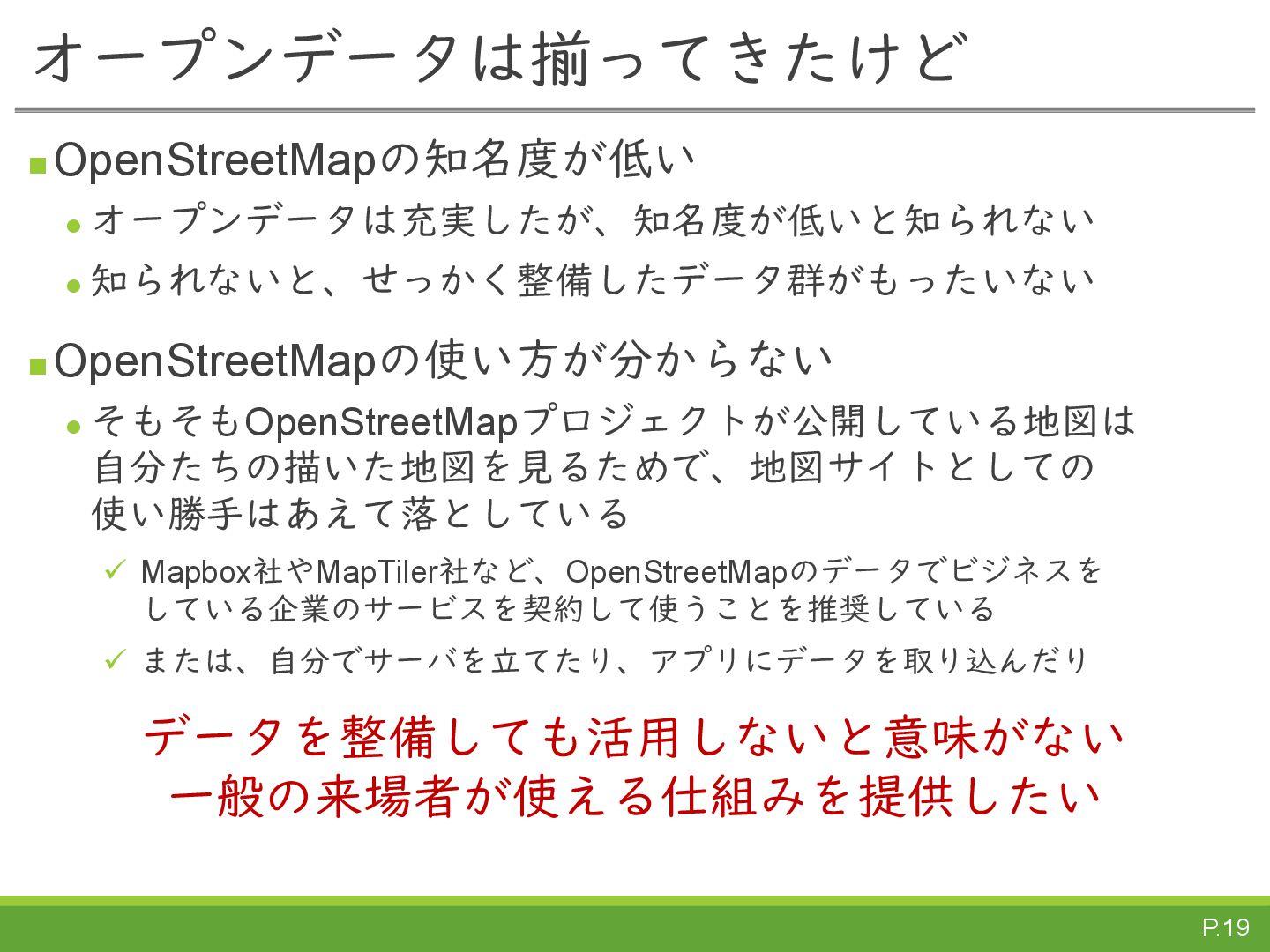 ⚫ そもそもOpenStreetMapプロジェクトが公開している地図は 自分たちの描いた地図を見るためで、地図サイトとしての 使い勝手はあえて落としている ✓ Mapbox社やMapTiler社など、OpenStreetMapのデータでビジネスを している企業のサービスを契約して使うことを推奨している ✓ または、自分でサーバを立てたり、アプリにデータを取り込んだり データを整備しても活用しないと意味がない 一般の来場者が使える仕組みを提供したい P.19