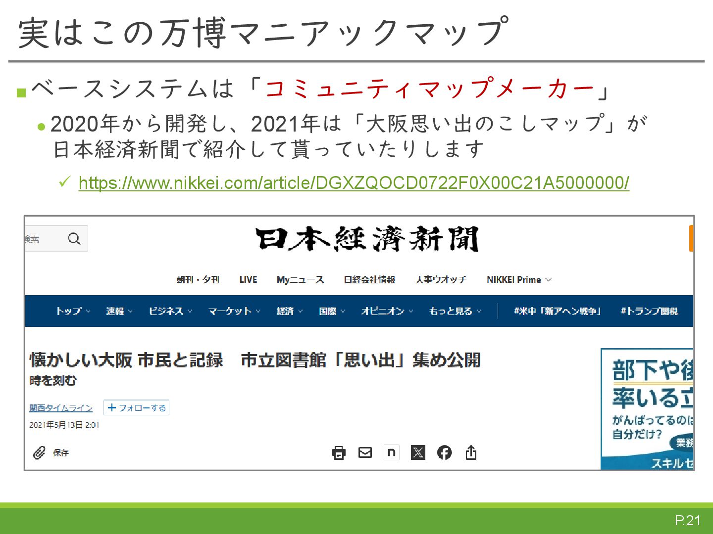 P.21 実はこの万博マニアックマップ ◼ ベースシステムは「コミュニティマップメーカー」 ⚫ 2020年から開発し、2021年は「大阪思い出のこしマップ」が 日本経済新聞で紹介して貰っていたりします ✓ https://www.nikkei.com/article/DGXZQOCD0722F0X00C21A5000000/ P.21