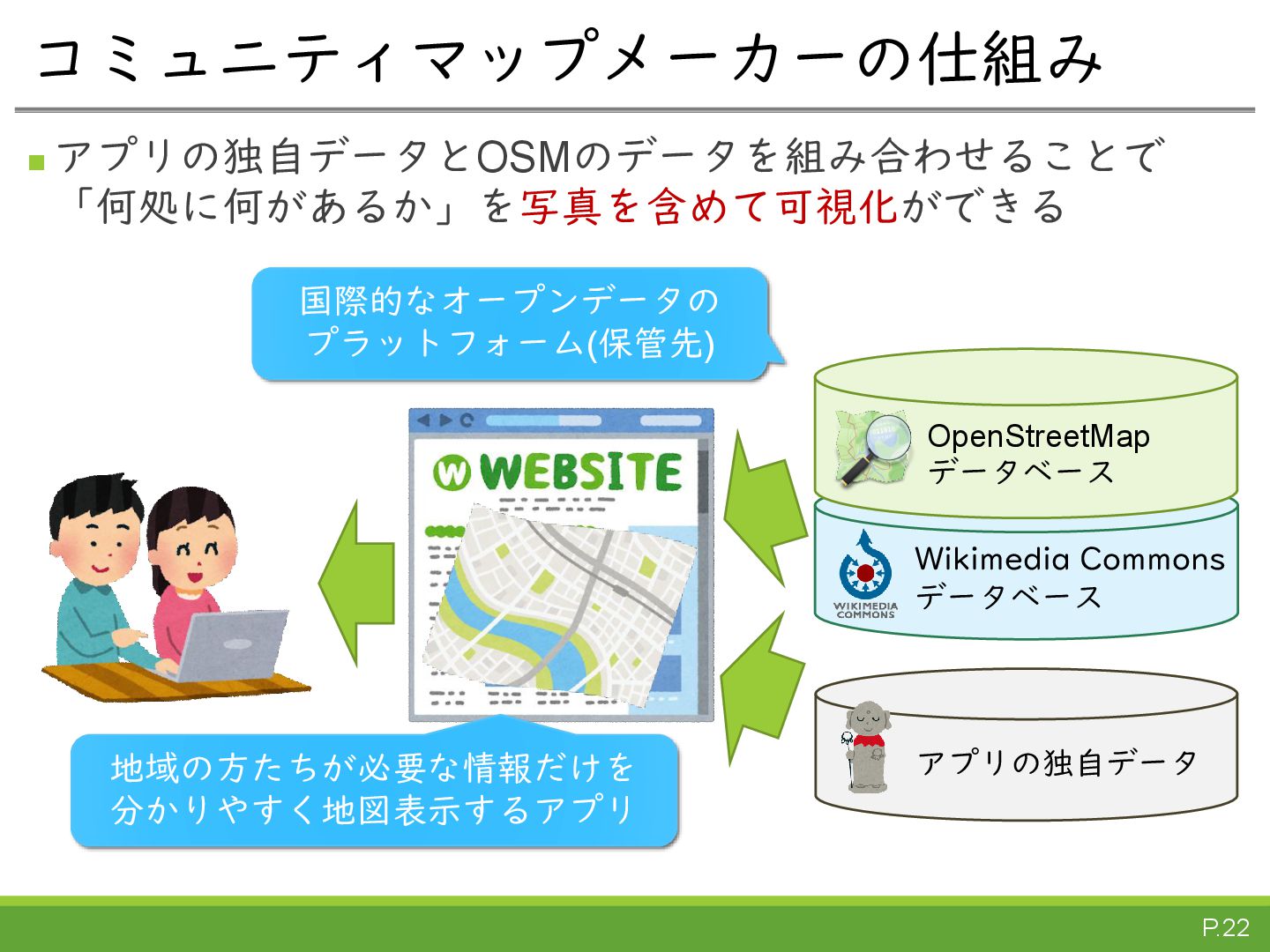 P.22 コミュニティマップメーカーの仕組み ◼ アプリの独自データとOSMのデータを組み合わせることで 「何処に何があるか」を写真を含めて可視化ができる Wikimedia Commons データベース OpenStreetMap データベース