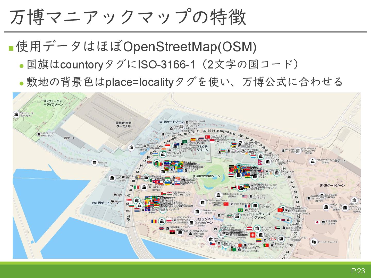 P.23 万博マニアックマップの特徴 ◼ 使用データはほぼOpenStreetMap(OSM) ⚫ 国旗はcountoryタグにISO-3166-1(2文字の国コード) ⚫ 敷地の背景色はplace=localityタグを使い、万博公式に合わせる P.23