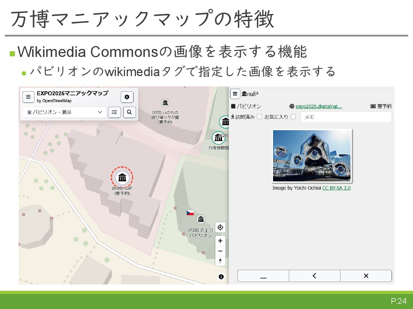 P.24 万博マニアックマップの特徴 ◼ Wikimedia Commonsの画像を表示する機能 ⚫ パビリオンのwikimediaタグで指定した画像を表示する P.24