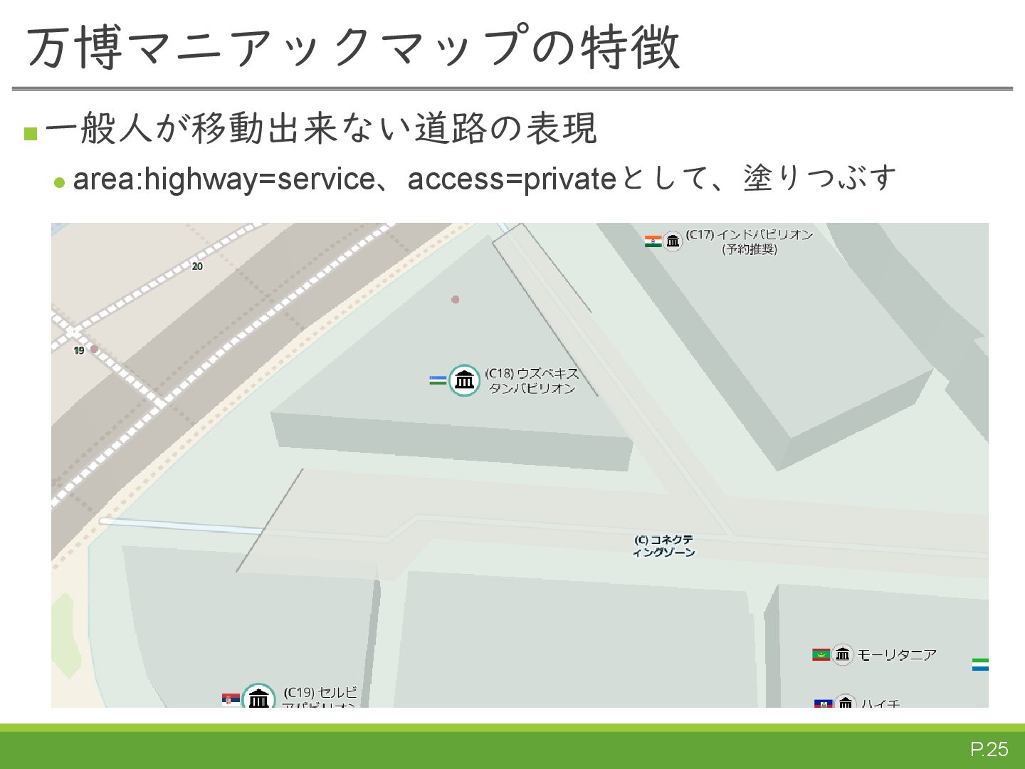 P.25 万博マニアックマップの特徴 ◼ 一般人が移動出来ない道路の表現 ⚫ area:highway=service、access=privateとして、塗りつぶす P.25
