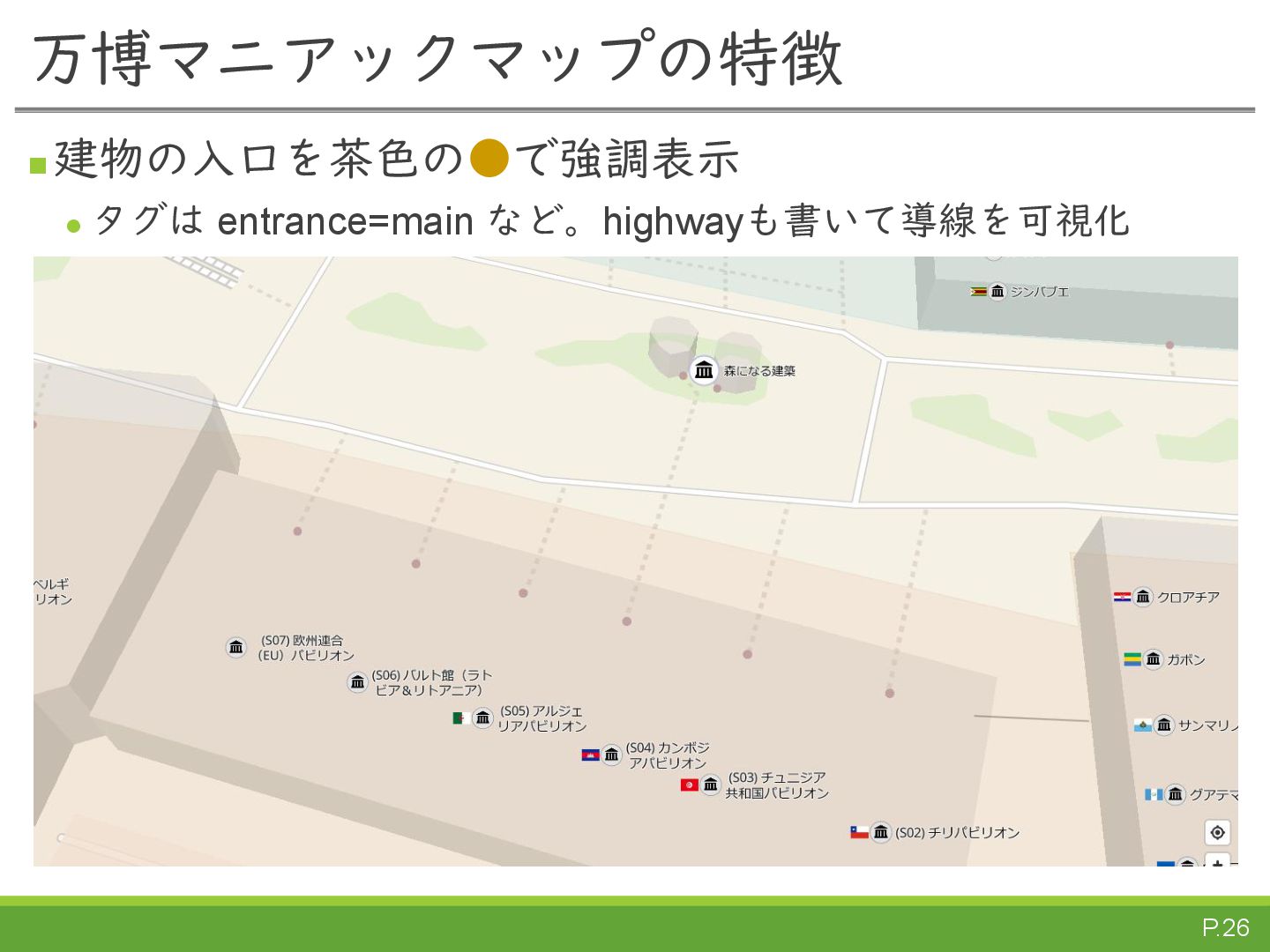 P.26 万博マニアックマップの特徴 ◼ 建物の入口を茶色の•で強調表示 ⚫ タグは entrance=main など。highwayも書いて導線を可視化 P.26