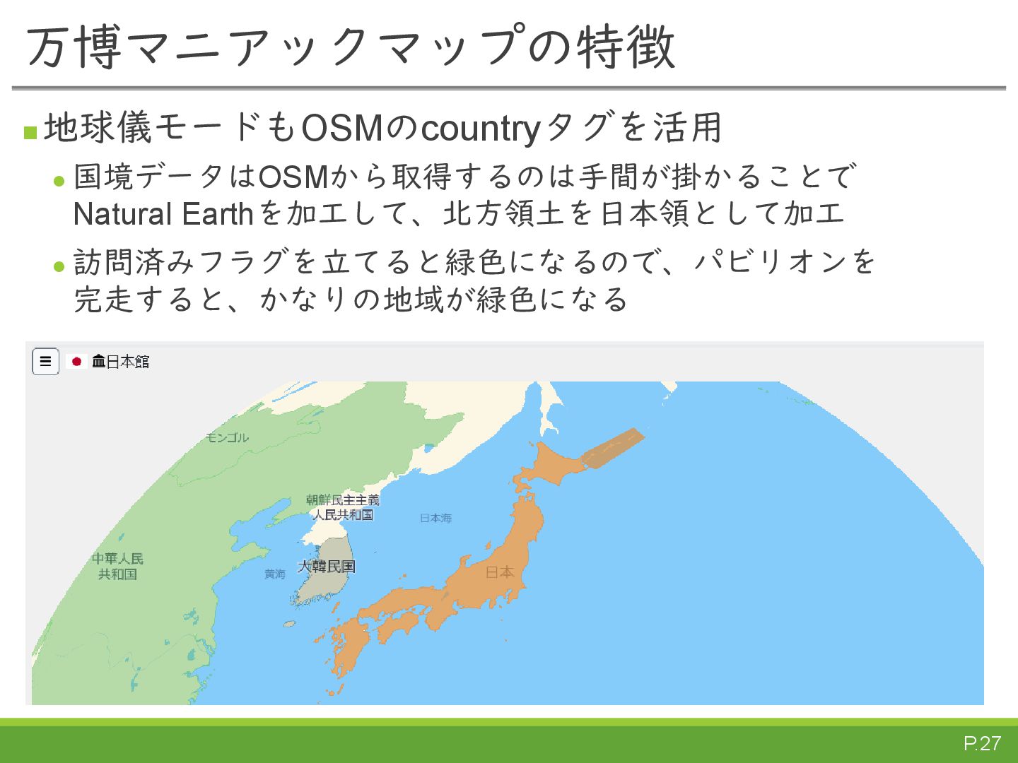 P.27 万博マニアックマップの特徴 ◼ 地球儀モードもOSMのcountryタグを活用 ⚫ 国境データはOSMから取得するのは手間が掛かることで Natural Earthを加工して、北方領土を日本領として加工 ⚫ 訪問済みフラグを立てると緑色になるので、パビリオンを