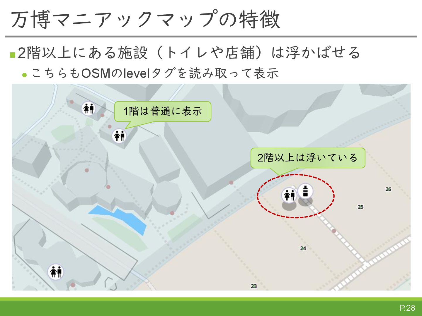 P.28 万博マニアックマップの特徴 ◼ 2階以上にある施設(トイレや店舗)は浮かばせる ⚫ こちらもOSMのlevelタグを読み取って表示 2階以上は浮いている 1階は普通に表示 P.28