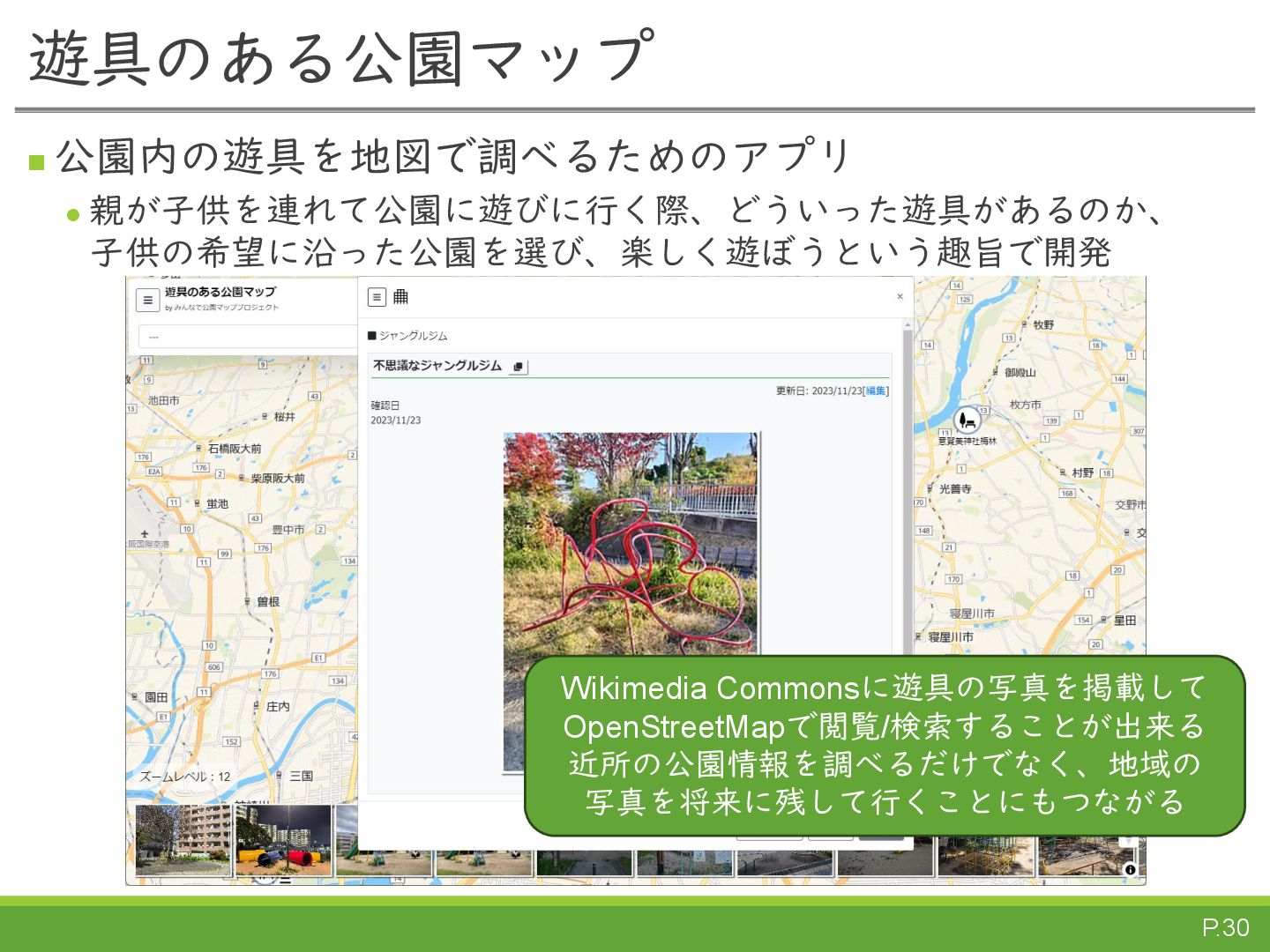 P.30 遊具のある公園マップ ◼ 公園内の遊具を地図で調べるためのアプリ ⚫ 親が子供を連れて公園に遊びに行く際、どういった遊具があるのか、 子供の希望に沿った公園を選び、楽しく遊ぼうという趣旨で開発 Wikimedia Commonsに遊具の写真を掲載して OpenStreetMapで閲覧/検索することが出来る