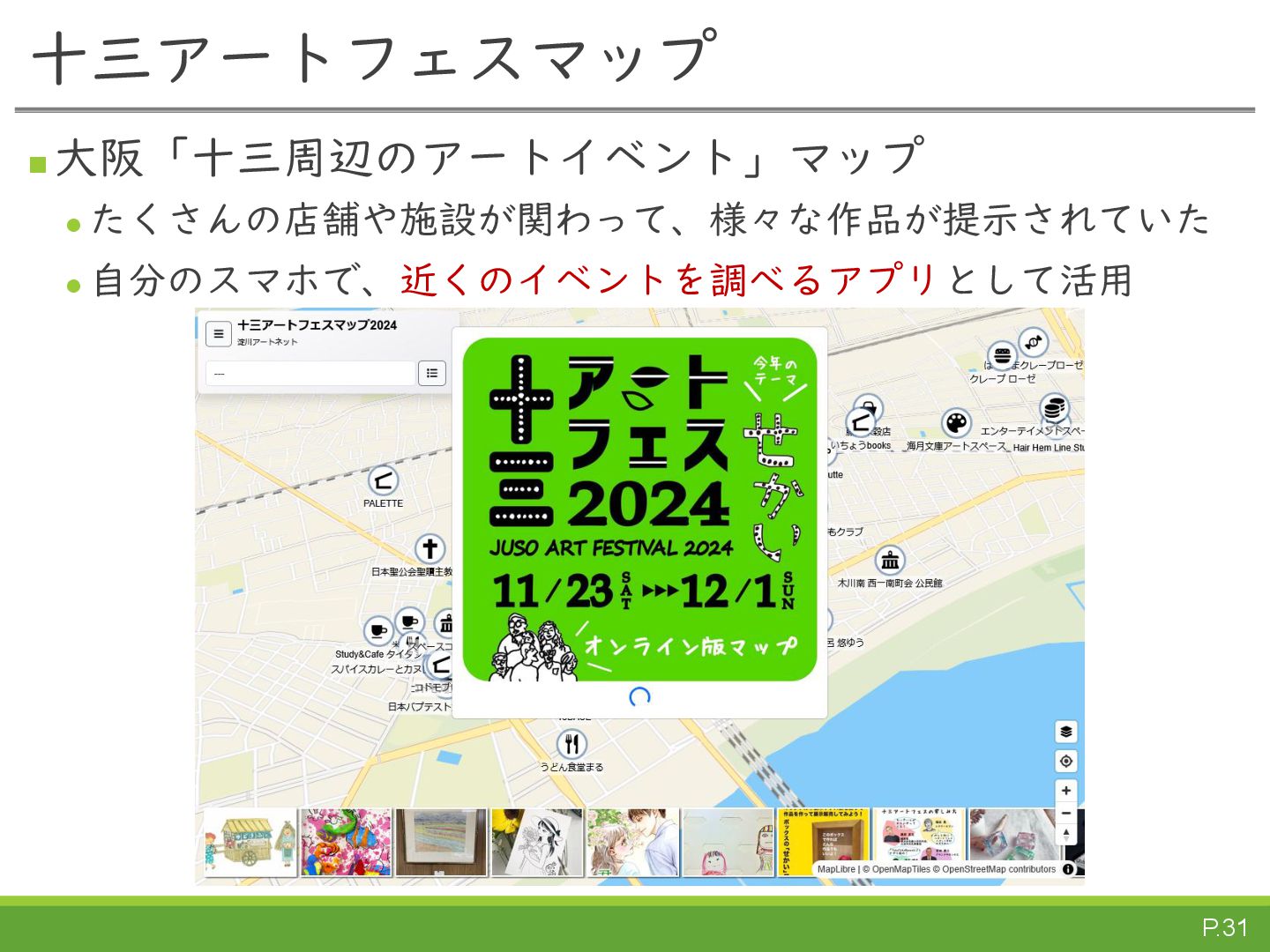 P.31 十三アートフェスマップ ◼ 大阪「十三周辺のアートイベント」マップ ⚫ たくさんの店舗や施設が関わって、様々な作品が提示されていた ⚫ 自分のスマホで、近くのイベントを調べるアプリとして活用 P.31